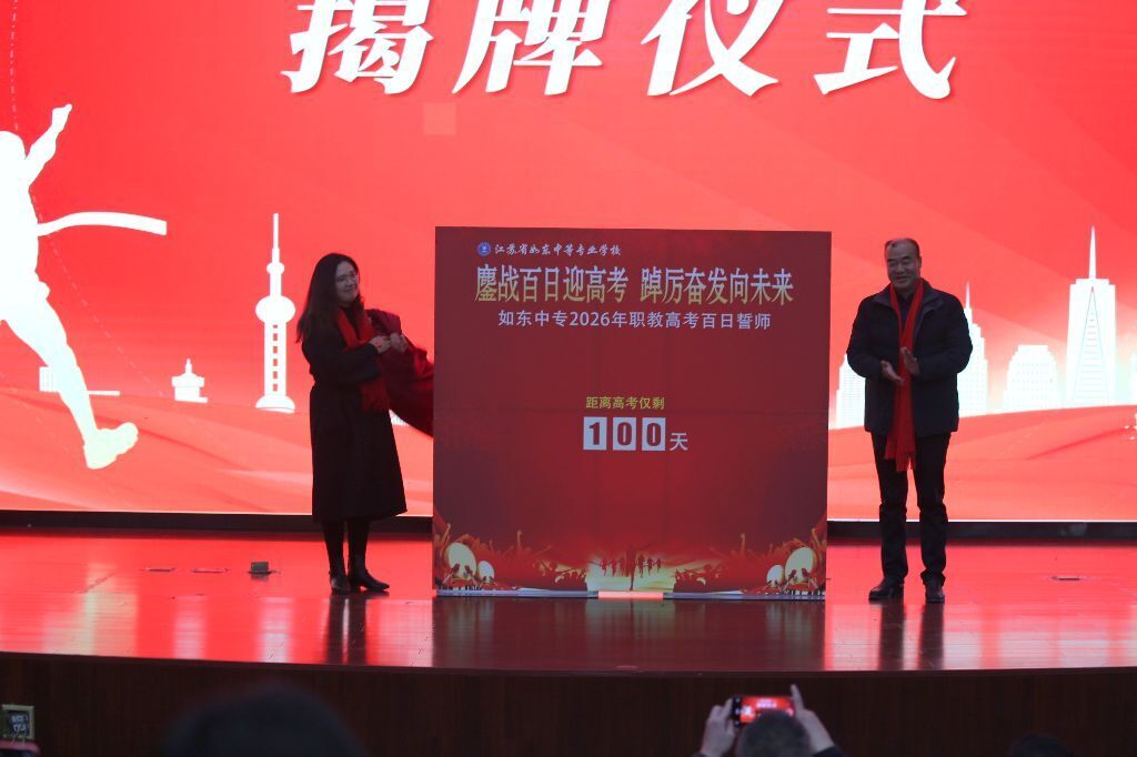 在全场师生整齐划一的 “5、4、3、2、1” 倒计时声中,丛书记与宋主任共同为倒计时牌庄严揭幕。鲜红醒目的 “100” 字样赫然映入眼帘,这不仅是时间的刻度,更是责任的彰显、梦想的坐标,时刻提醒着每一位考生珍惜光阴、全力以赴。