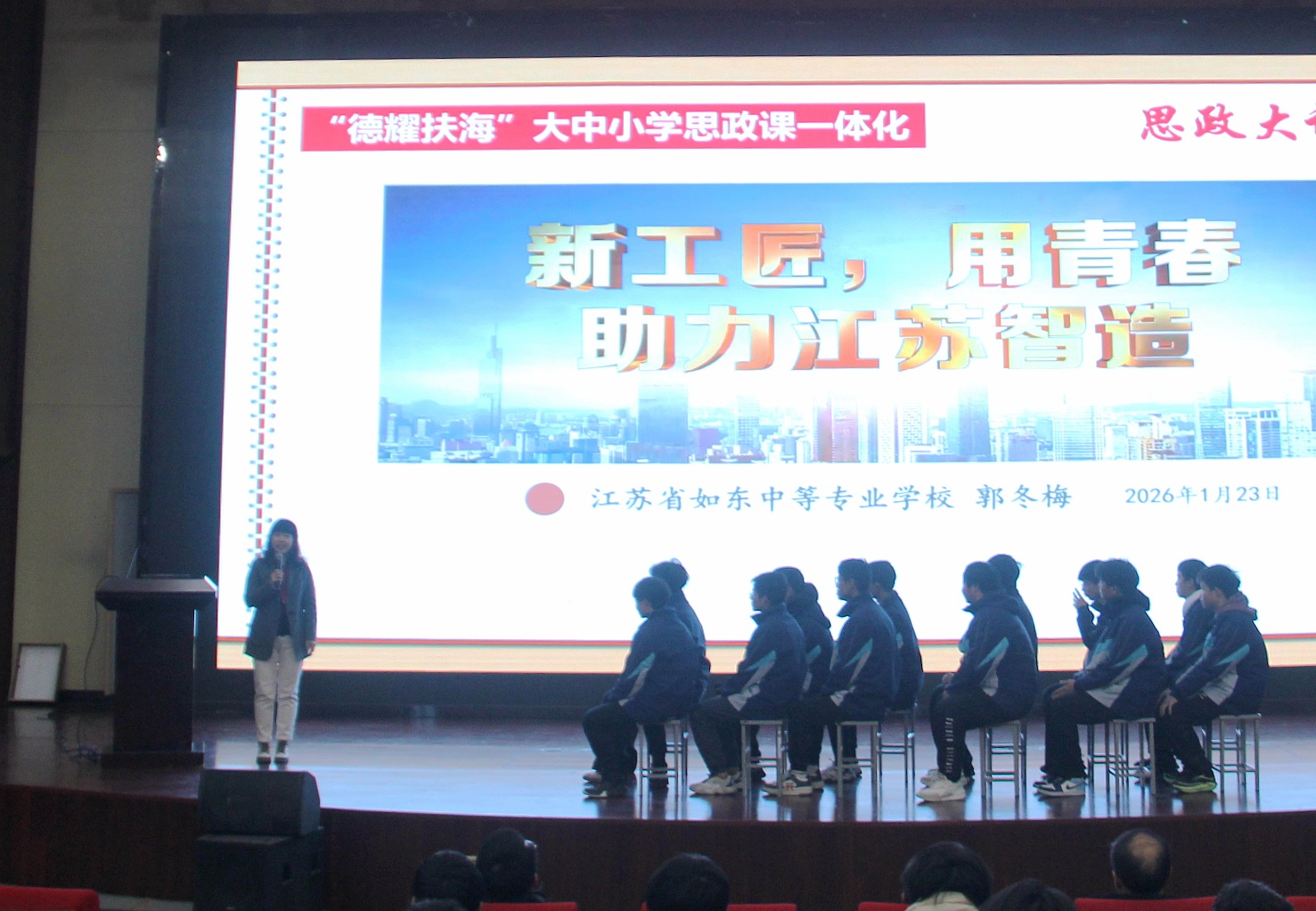 会议首先邀请南通市学科带头人、校思政教研组组长郭冬梅老师为全体学生开设了《新工匠 用青春助力江苏智造》思政教育大课堂,郭老师结合江苏智造发展实践,阐释新时代工匠精神的内涵,引导学生将个人青春理想融入产业升级浪潮,厚植家国情怀,激发学子以精湛技艺、责任担当助力江苏智造高质量发展的青春热情。