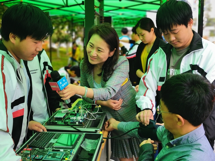 信息工程系学生向记者介绍该团队组装的无人机