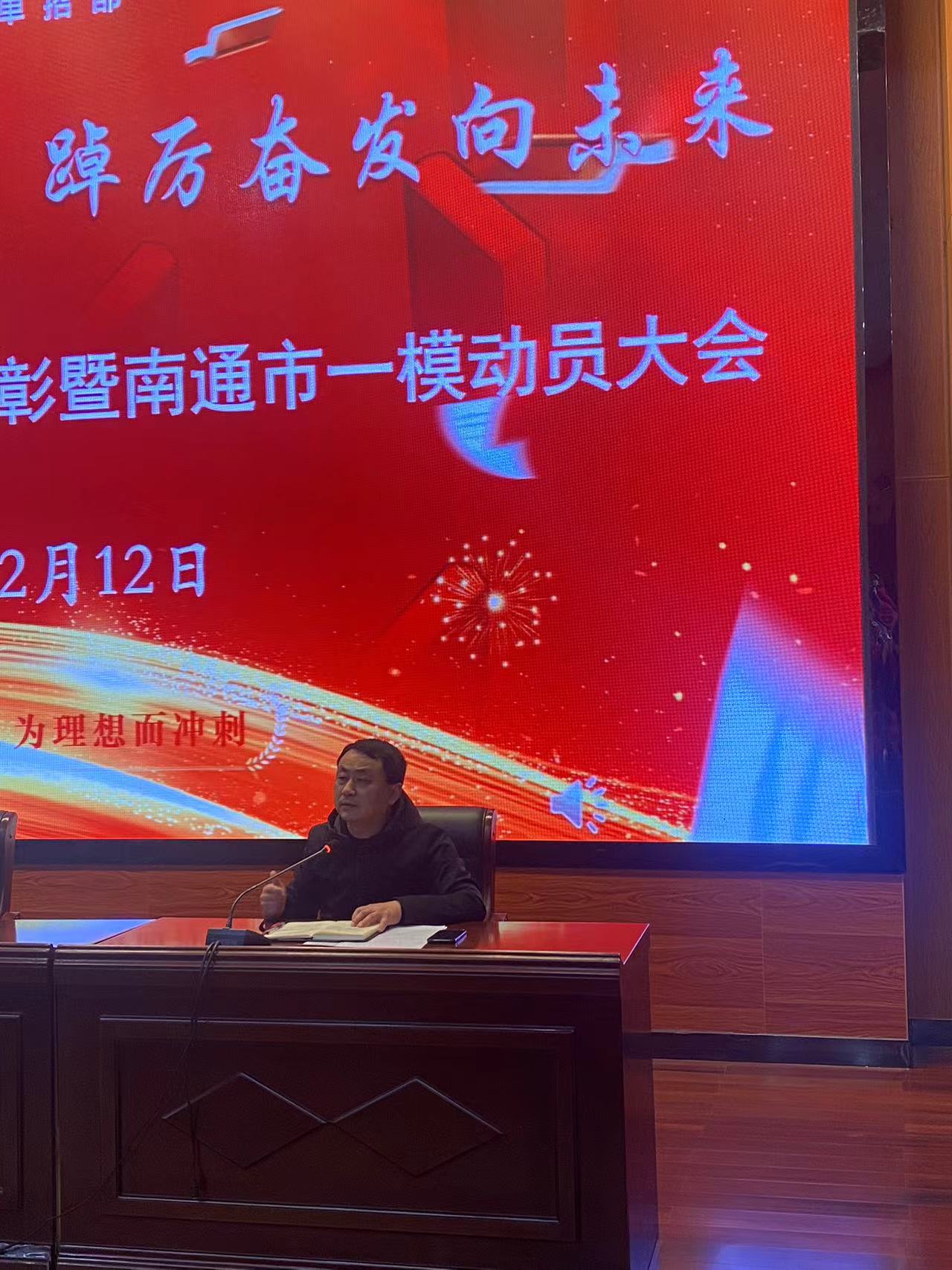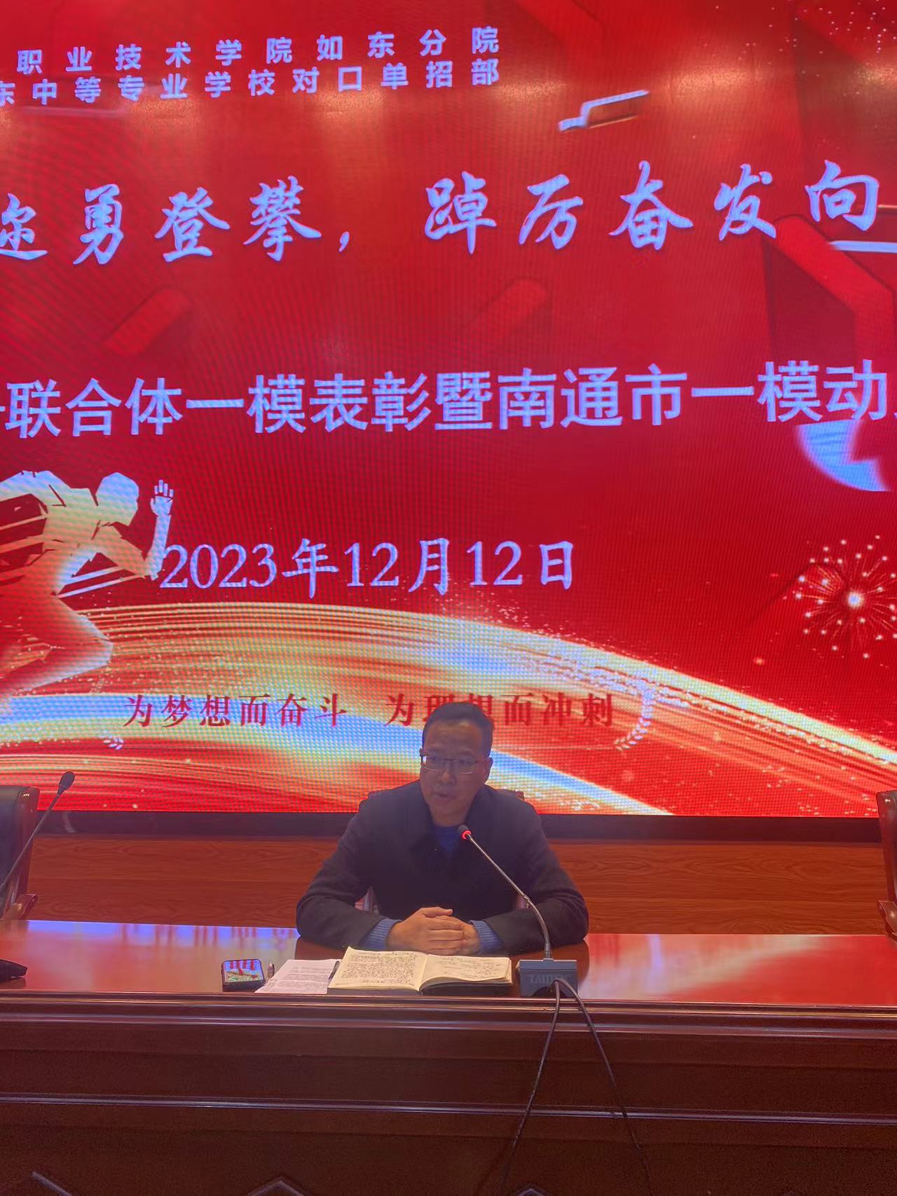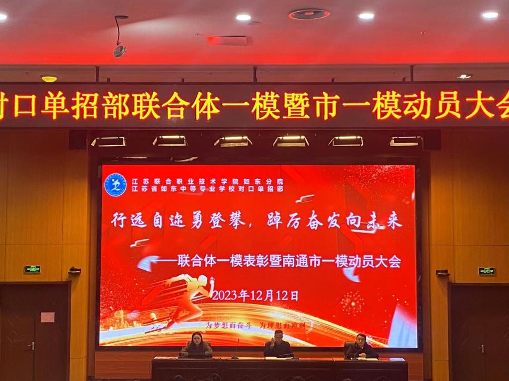 为了树立榜样,表彰优秀,激发斗志,12月12日下午,对口单招部在学校敬业堂召开联合体一模表彰暨南通市一模动员会。对口单招部主任陆建荣、副主任于军、全体高三班主任及学生参加了本次会议。会议由年级组长石晓娟主持。