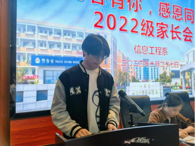 22计算机应用技术(2)班姜瞿浩同学代表全体22级学生向家长、老师表达感恩之情,并号召全体同学把学习作为一种责任、一种精神追求、一种生活方式,树立梦想从学习开始、事业靠本领成就的观念,让勤奋学习成为青春远航的动力,让增长本领成为青春搏击的能量。