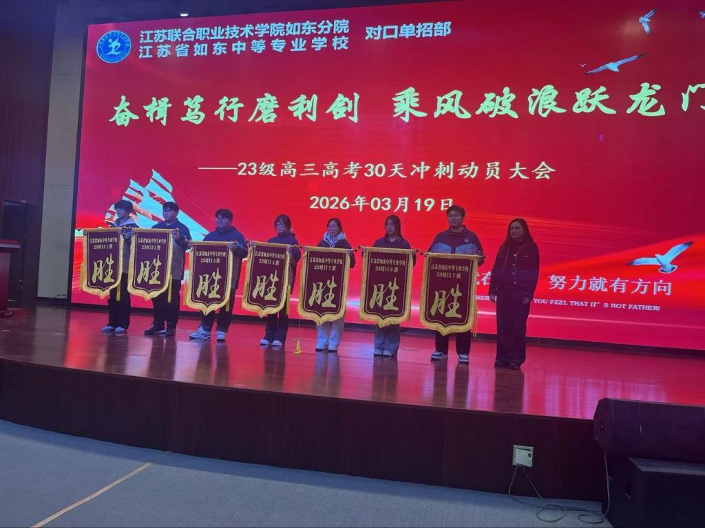 现场授旗仪式将氛围推向高潮。伴随着激昂的乐曲,对口单招部宋丽华主任将印有“胜”的冲刺战旗,郑重授予各班代表。鲜红的旗帜承载着学校的期许与嘱托,更凝聚着全体学子的拼搏决心。