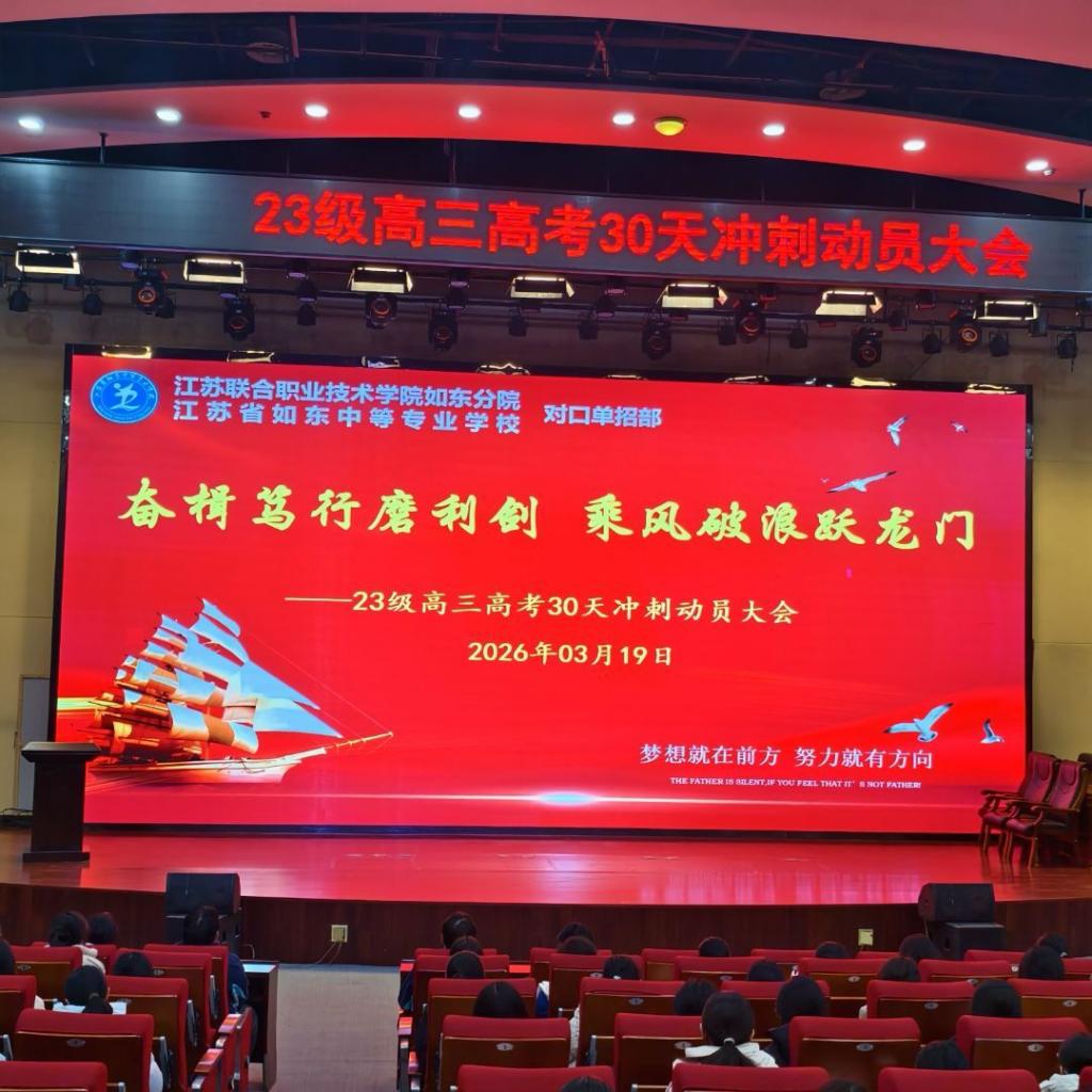 战鼓催征急,奋进正当时。为进一步点燃全体备考学子的拼搏斗志,坚定决胜2026年职教高考的信心与决心,2026年3月19日下午,对口单招部在我校敬德堂隆重召开2026年职教高考30天冲刺动员大会。教务处主任陆海鸣、对口单招部主任宋丽华、高三年级主任唐小慧、全体高三学生及班主任齐聚一堂,共同吹响冲刺集结号,以昂扬饱满的姿态迎接即将到来的职教高考。