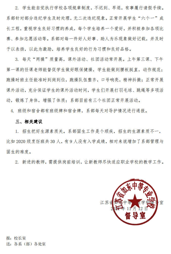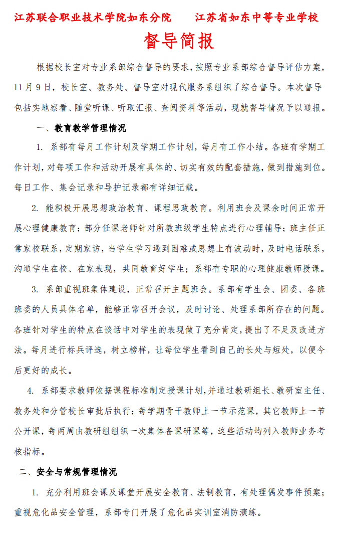 江苏联合职业技术学院如东分院 江苏省如东中等专业学校系部督导简报2