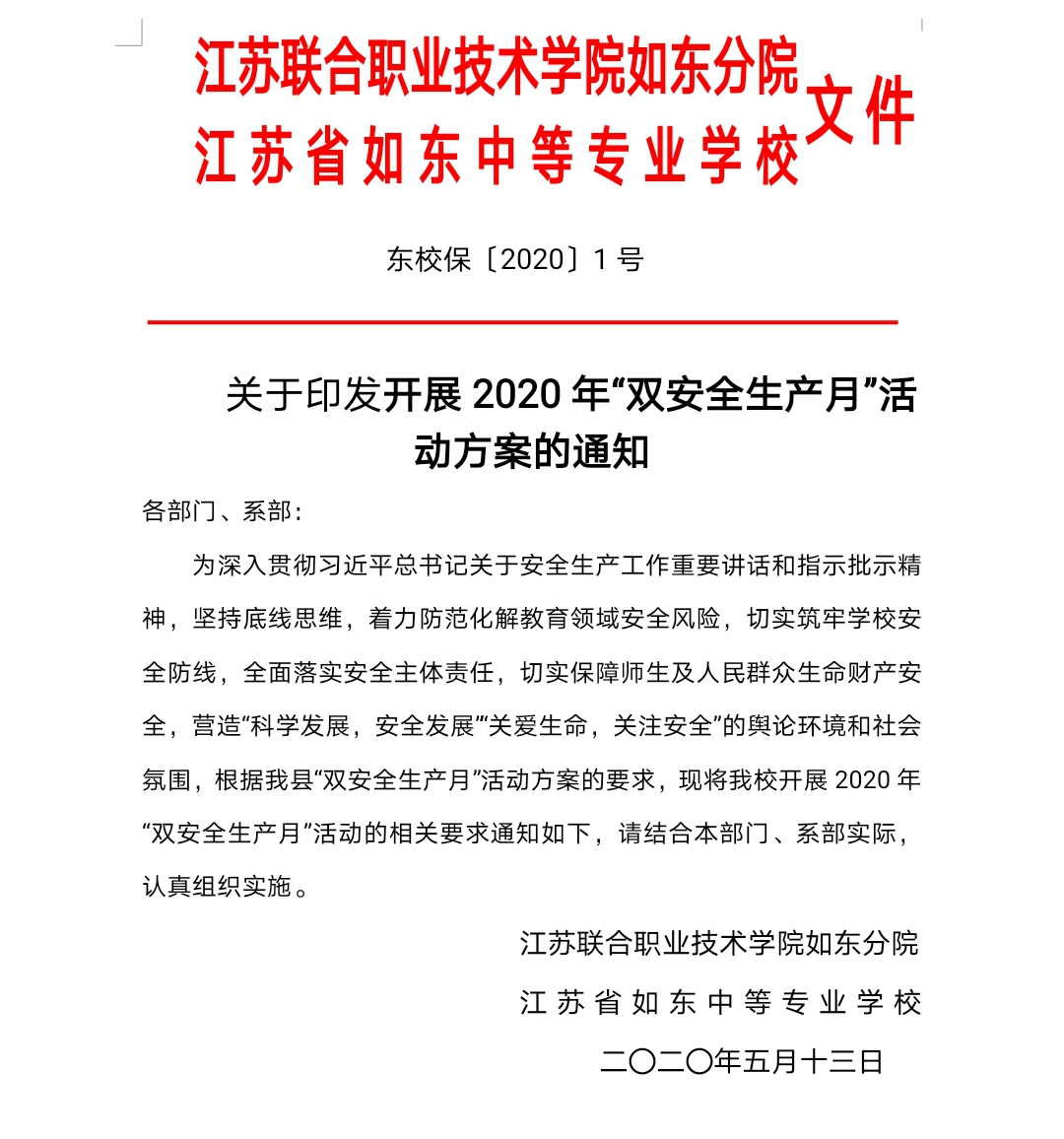 关于印发2020年《学校双安全生产月活动工作方案》的通知.doc