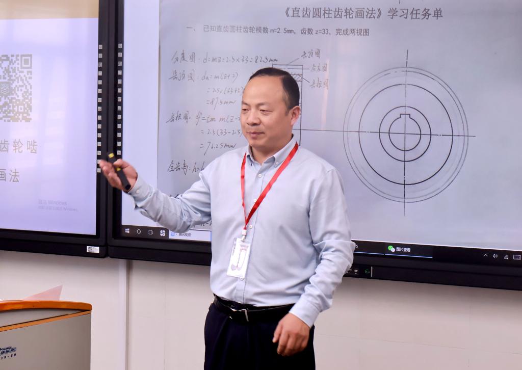 ▼如皋中专戴宏兵:本节课的设计从合作企业的生产设备实例中“齿轮传动”导入课题,对于本节课圆柱齿轮的画法,以直齿圆柱齿轮为例,从齿轮的各部分名称及尺寸计算开始,循序渐进,层层深入,引导学生观看微视频进行自主探究、小组合作学习,让学生学会计算、学会作图,并在课堂上踊跃发言,积极进行成果展示。本次教学通过多种综合评价方式来检测学习效果,贯穿了“德技并修、双元育人”的教学思想。
