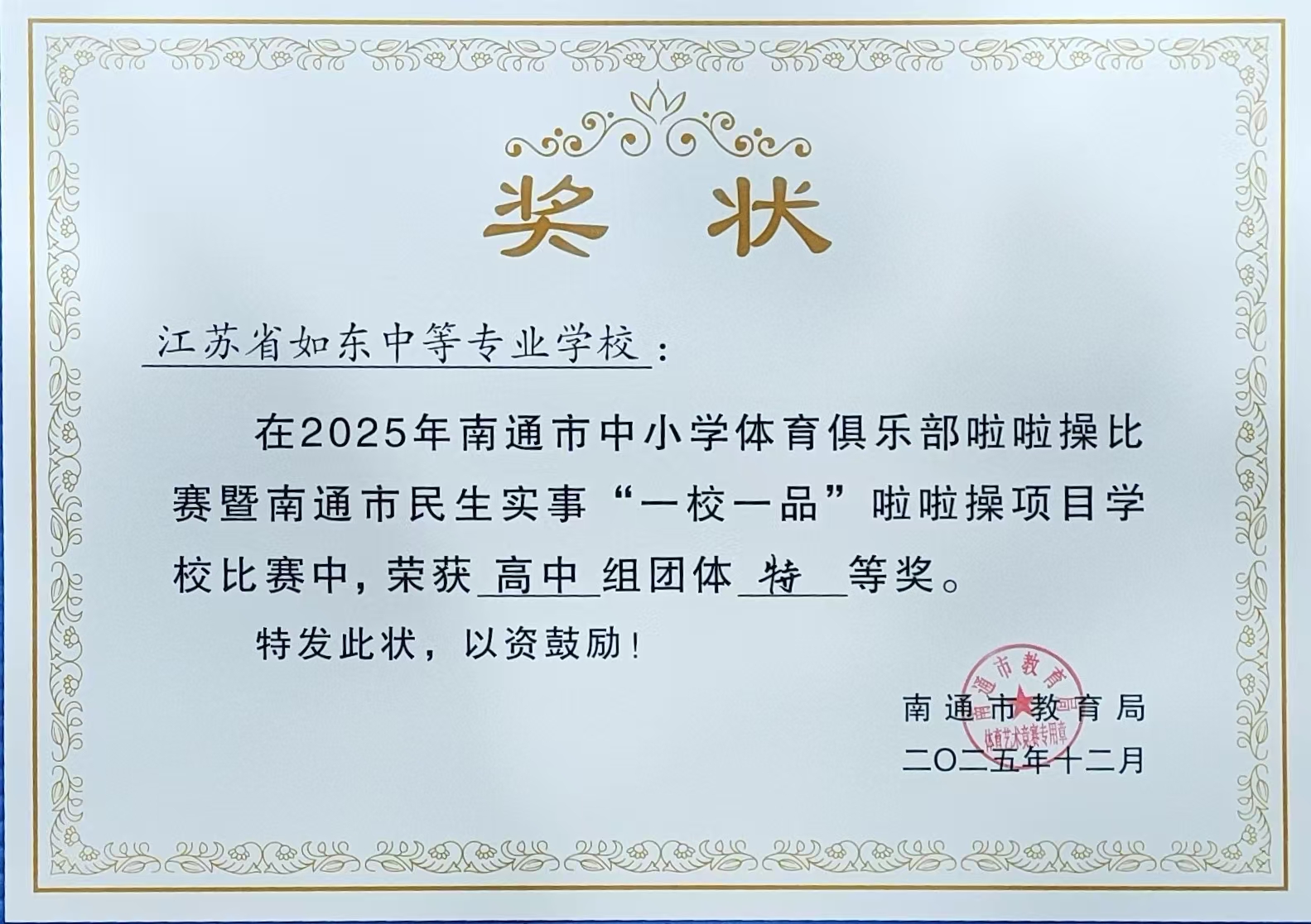 啦啦操比赛是南通市校园体育的年度品牌赛事,不仅为青少年搭建了展示风采、挑战自我的舞台,也为校园美育与体育的深度融合提供了实践平台。如东中专将以此次获奖为新的起点,持续推动阳光体育运动和校园体育文化建设,鼓励更多学生走向操场、拥抱健康,让“健康第一”的教育理念在学校落地生根、结出硕果。