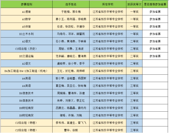 6月7日,2020年南通市职业学校教学大赛决赛落下帷幕。本次教学大赛分初赛和决赛两个环节。在首轮初赛中,来自全市的213个教学团队参加比赛,经网络专家的严格评审,共有111个团队进入决赛,其中我校11个参赛团队进入决赛。通过对参赛作品的进一步精心打磨,在决赛环节中,我校团队取得了4个一等奖、7个二等奖、8个三等奖的好成绩。其中于胜楠团队(德育)、秦小玉团队(数学)、任进团队(体育)、马绿丹(土木水利)团队、石晓燕团队(语文)、周骏团队(历史)、范承嗣团队(交通运输)等7个团队将代表南通市参加省赛。对于接下来的省赛,我校参赛选手纷纷表示,将会全力以赴,认真向专家学习,力争取得更加优异的成绩。
