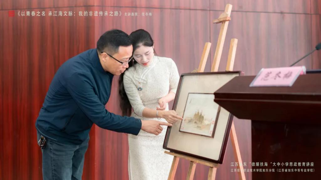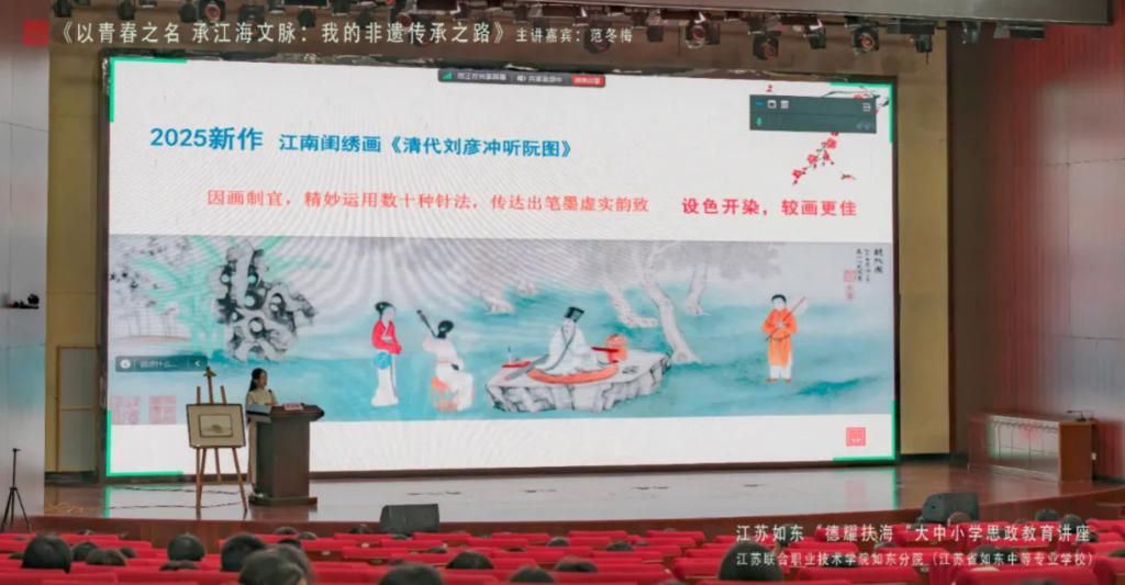 近日,上海市嘉定区嘉定镇街道重点文化领域党支部书记、上海慧绣文化发展有限公司艺术总监范冬梅女士应邀赴江苏联合职业技术学院如东分院(江苏省如东中等专业学校)做《以青春之名 承江海文脉:我的非遗传承之路》主题报告。该讲座是如东县教育体育局为深入贯彻落实习近平总书记关于思政课建设的重要指示精神,推进大中小学思想政治教育一体化建设,结合县思政教育工作实际,整合优质教育资源打造的具有如东特色的“德耀扶海”思政教育品牌活动之一。