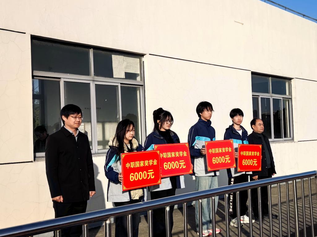 在热烈的掌声中,副校长陈建、肖海兵走上颁奖台,为获得高职国家励志奖学金、中职国家奖学金的获奖学生代表颁发荣誉证书与奖金。获奖学子们身着整洁校服,精神饱满地接过荣誉,脸上洋溢着自豪与喜悦。这一张张证书不仅是对他们过往努力的肯定,更是对他们未来前行的鞭策,台下师生纷纷投去赞许的目光,现场掌声经久不息。