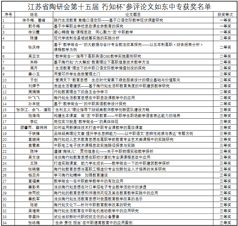 近日,江苏省陶研会第十五届“行知杯”论文评比获奖名单公布。我校共有34篇论文获奖,其中3篇论文获一等奖、11篇论文获二等奖、20篇论文获三等奖,祝贺获奖老师们!