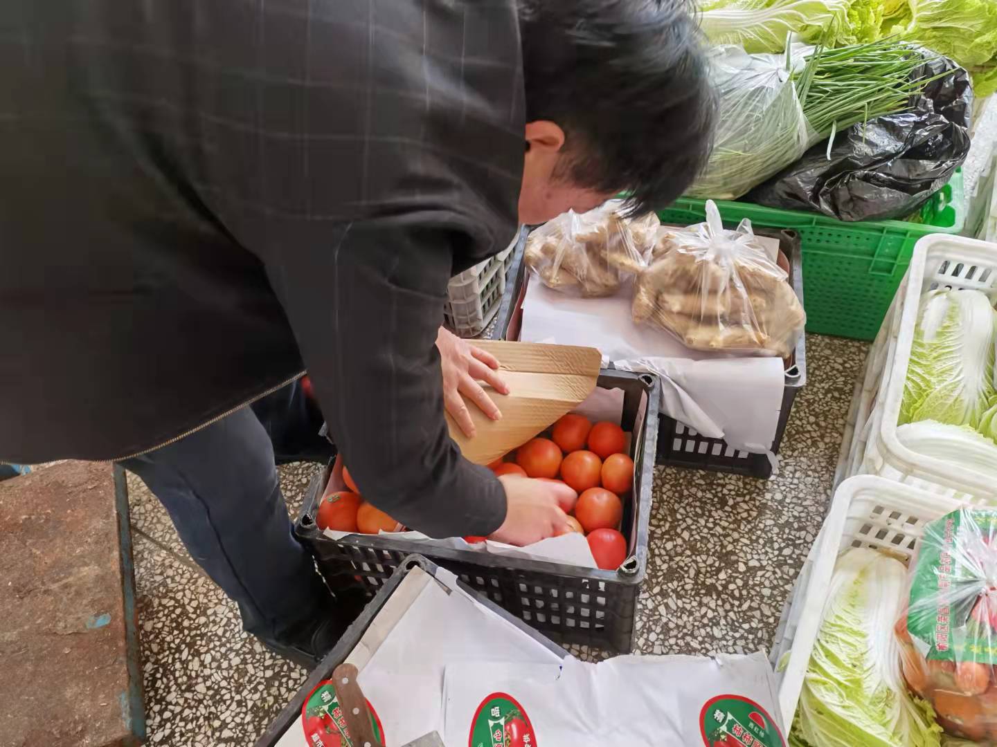 6:00开始,食材供应商开始陆续给食堂送货。食堂安全监督员周友军带领验收组以及保管员开始验货、称重、收菜。查看猪肉上的印花、检查品种是否一致、蔬菜品质是否符合要求等等。周友军说:“这个工作就是要认真细致。”