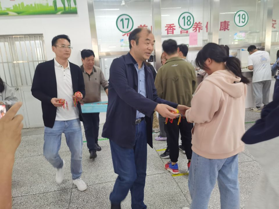 夏季天气炎热,人们容易四肢无力、食欲减退,称之为“疰夏”。立夏吃蛋能预防这些苦夏症状,避免疰夏。如东分院食堂工作人员用一条条彩绳编织成精美的蛋袋,将煮好的鸡蛋装于其中。校长丛杰、副校长曹卫民、党政办主任肖海兵、总务处主任徐西群、学工处主任许建华及食堂工作人员一同将装好的“立夏蛋”发放给学生,为学生茁壮成长增添力量。