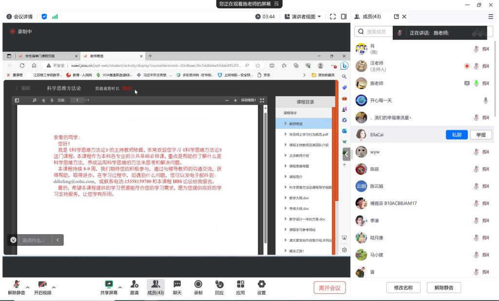 为方便大家尽快熟悉开放大学的学习要求,尽早开展自主学习,10月31日晚7点,施老师通过腾讯视频会议再次给23秋学员做开放教育专题培训。培训内容包括开放教育的作业、成绩构成、学分转换、学位要求、考试要求等几个方面。