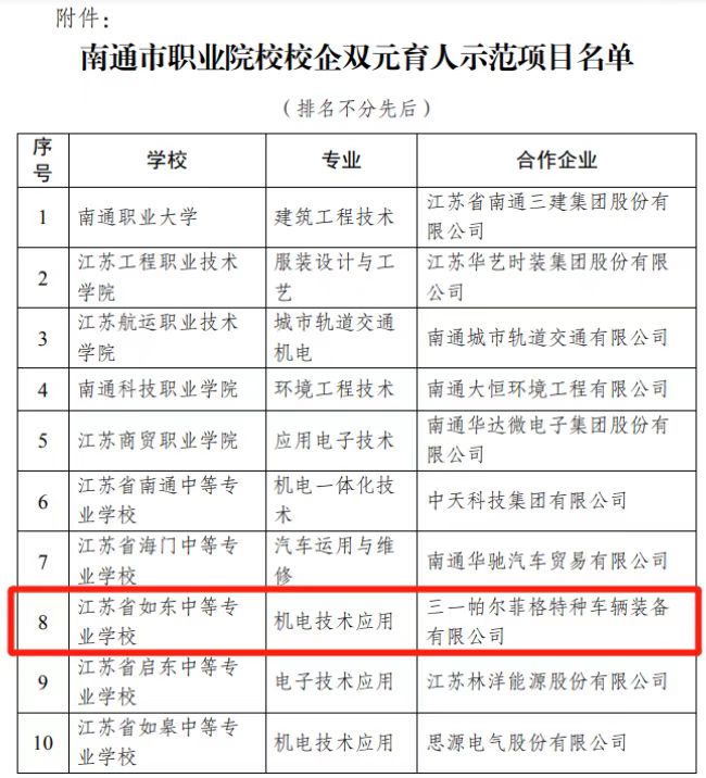 近日,南通市教育局发布《关于南通市职业院校校企双元育人示范项目名单的公示》,我校与三一帕尔菲格特种车辆装备有限公司联合开展的现代学徒制试点项目获评南通市职业院校校企双元育人示范项目。这是我校在内涵建设项目上取得的又一重大成果。