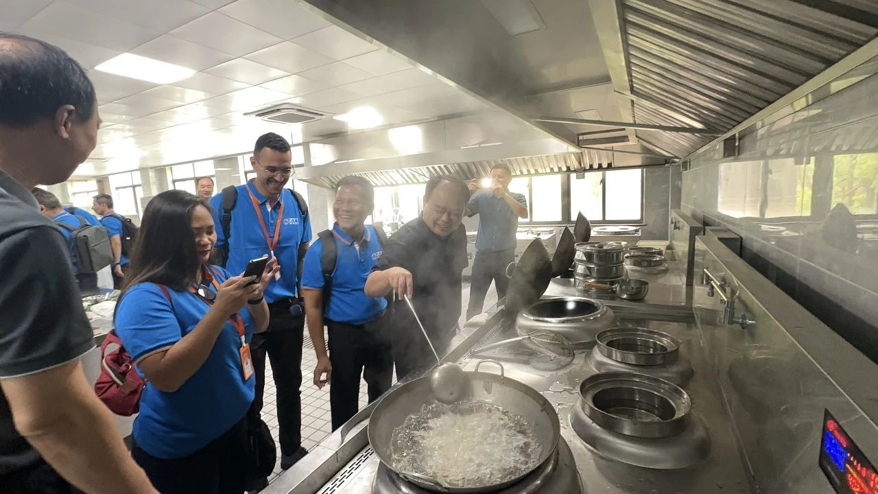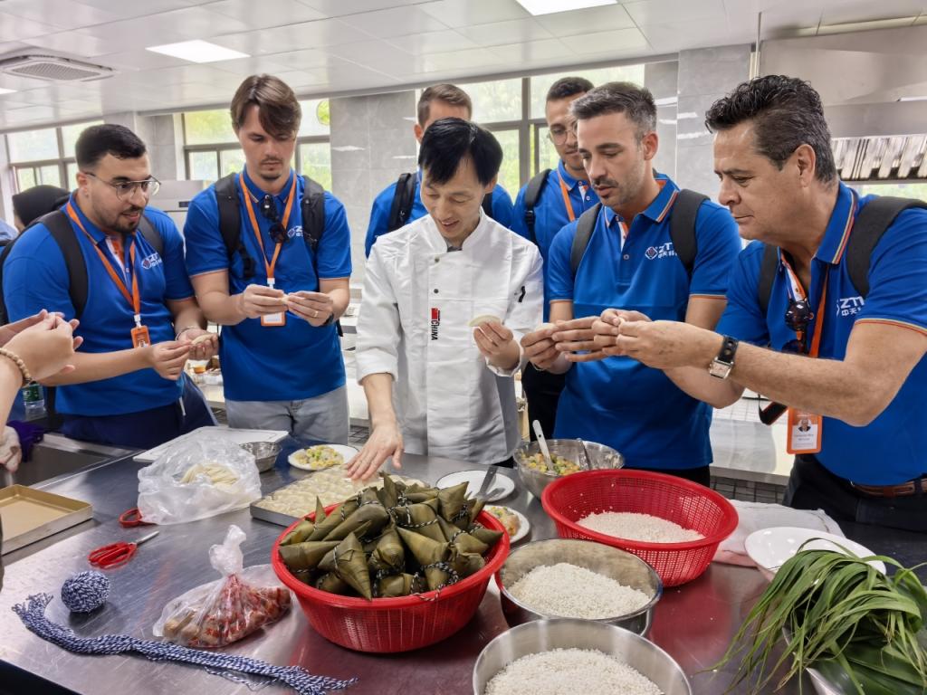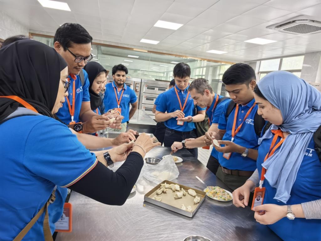 接着,中式烹饪文化体验活动在一号实验楼二楼展开。在现代服务管理系吴建雄主任及烹饪专业老师的指导下,海外员工们动手学习包饺子、裹粽子。从准备食材与工具、调馅料到烹饪,每一个环节都充满了新奇与乐趣。大家互相帮助、互相学习,现场欢声笑语不断。当大家亲手制作的美食新鲜出炉时,不仅让味蕾得到了享受,也让海外员工们对中国美食文化的深厚底蕴有了更深的认识。