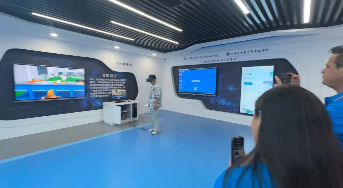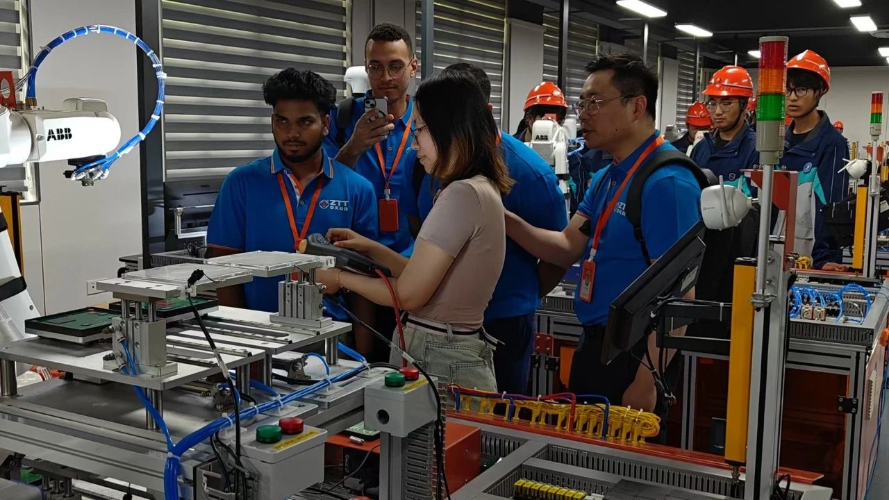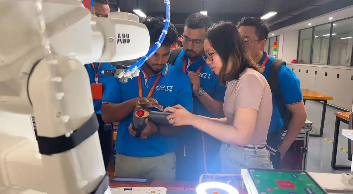 随后,海外员工们走进学校工业机器人实验室,在机电工程系周卫东主任的介绍下,了解工业机器人的功能与应用。先进的技术设备、智能化的操作流程,让他们直观感受到学校在职业教育领域的专业与创新。