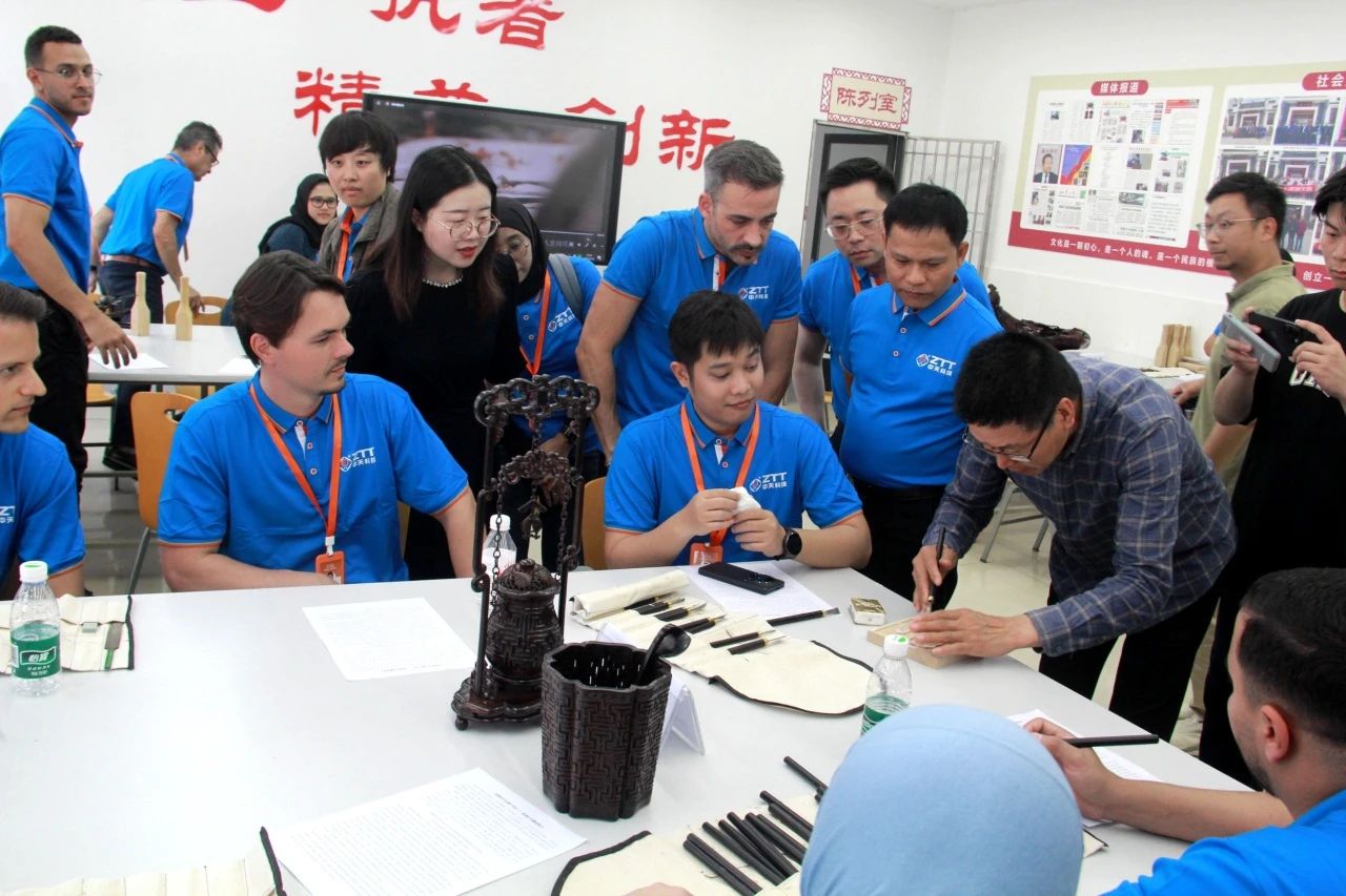 欢迎仪式结束后,海外优秀员工们开启了校内观摩体验之旅。他们首先来到刘承林大师工作室,沉浸式体验雕刻文化。精美的雕刻作品、精湛的雕刻技艺,让海外员工们赞叹不已。他们近距离感受着中国传统雕刻文化的独特魅力,不时拿出手机记录下这些精彩瞬间,并与同行人员分享自己的震撼与惊喜。
