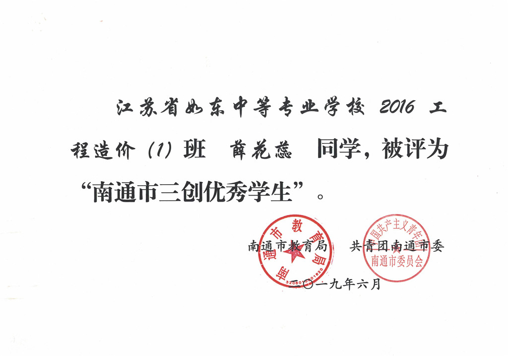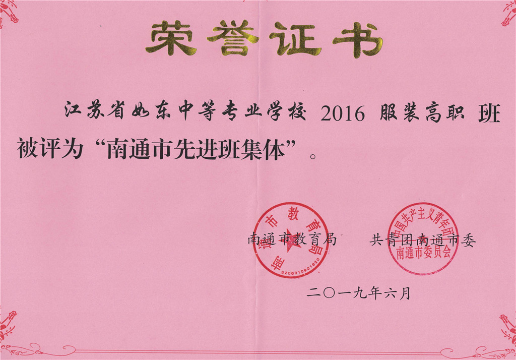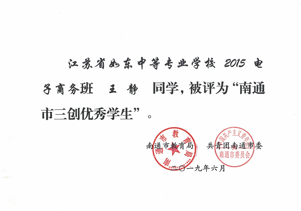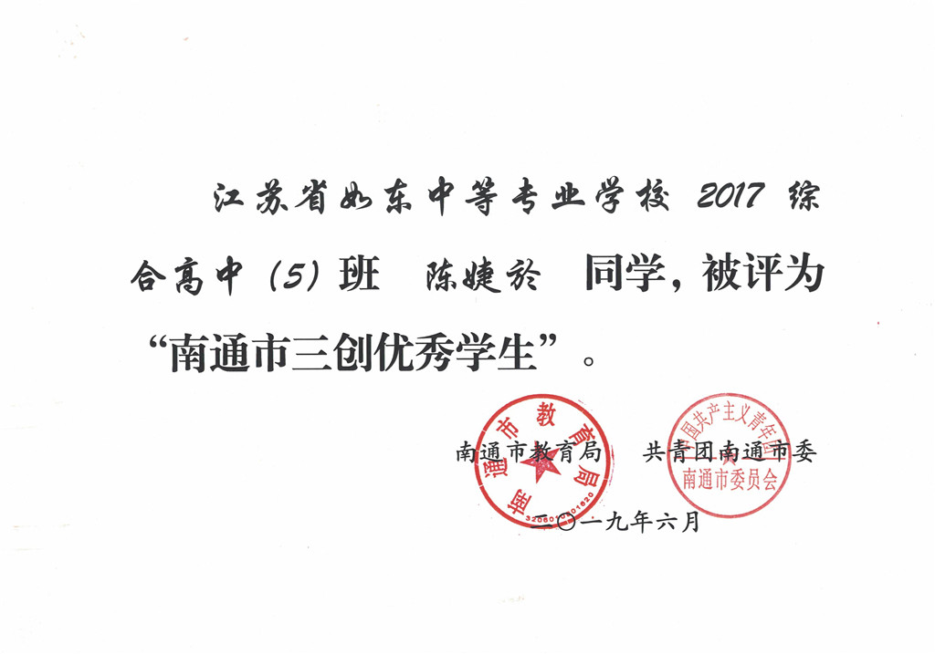 在今年的“三创”优秀评比活动中,江苏联合职业技术学院如东分院、江苏省如东中等专业学校2016级服装高职班、2016级对口7班、2017级会计高职2班、2015级工程造价1班、2016级汽修高职1班、2016级对口2班等6个班级被市教育局、团市委表彰为“南通市先进班集体”;郁韩佳、汤文杰、陈昊、张敏、丛蓉等5名同学被市教育局、团市委表彰为“南通市优秀学生干部”;陈婕於、薛花蕊、朱剑飞、张缪翔、王静、陈婕等6名同学被市教育局、团市委表彰为“南通市三创优秀学生”。