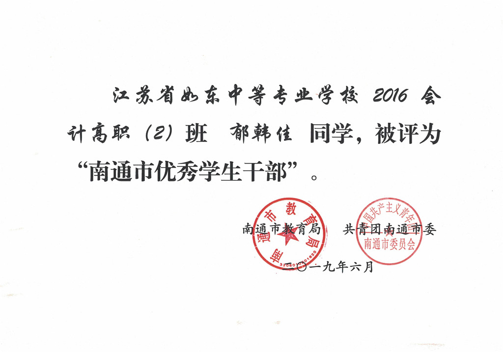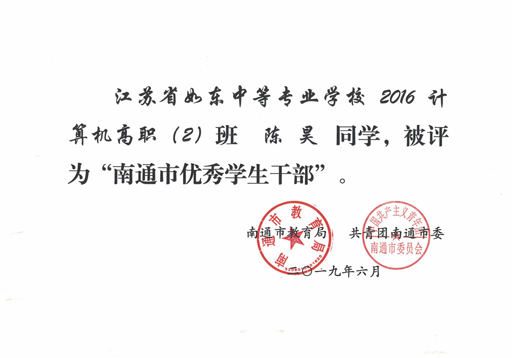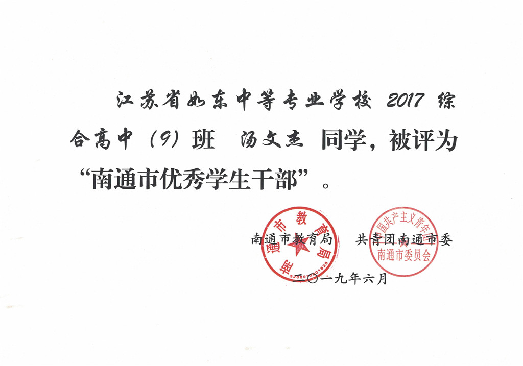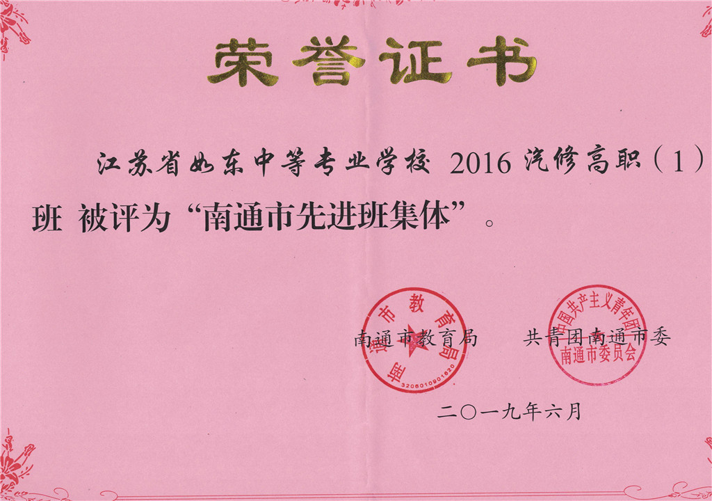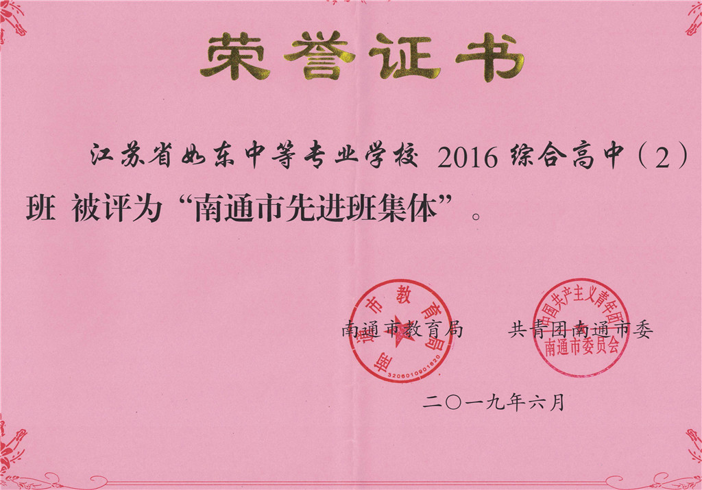 在今年的“三创”优秀评比活动中,江苏联合职业技术学院如东分院、江苏省如东中等专业学校2016级服装高职班、2016级对口7班、2017级会计高职2班、2015级工程造价1班、2016级汽修高职1班、2016级对口2班等6个班级被市教育局、团市委表彰为“南通市先进班集体”;郁韩佳、汤文杰、陈昊、张敏、丛蓉等5名同学被市教育局、团市委表彰为“南通市优秀学生干部”;陈婕於、薛花蕊、朱剑飞、张缪翔、王静、陈婕等6名同学被市教育局、团市委表彰为“南通市三创优秀学生”。