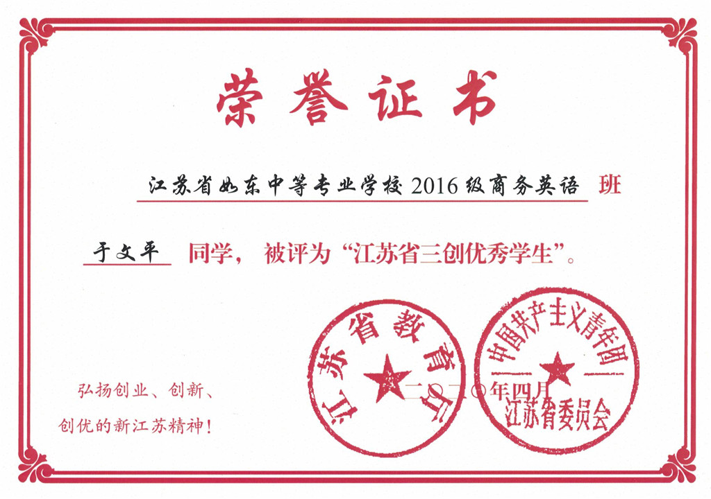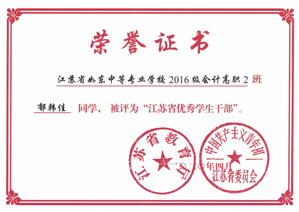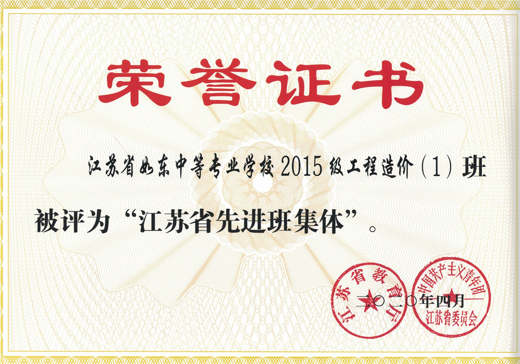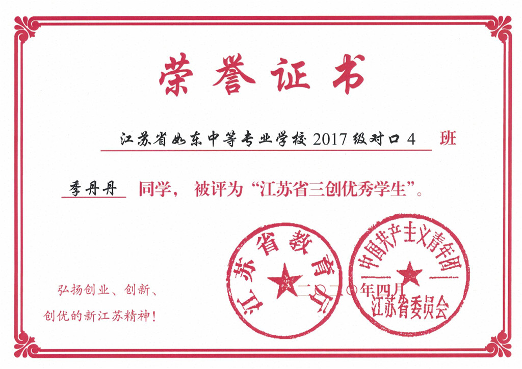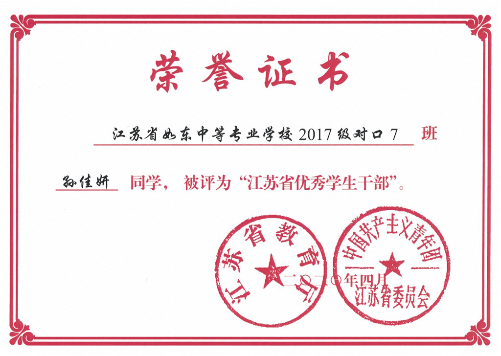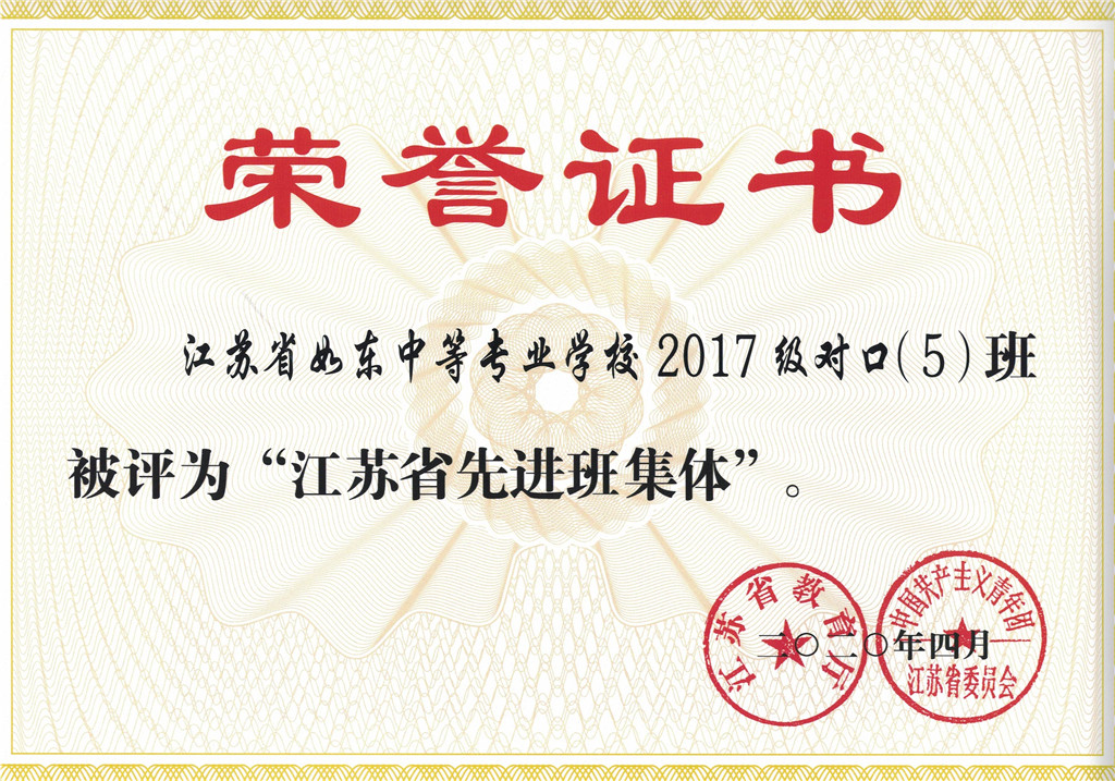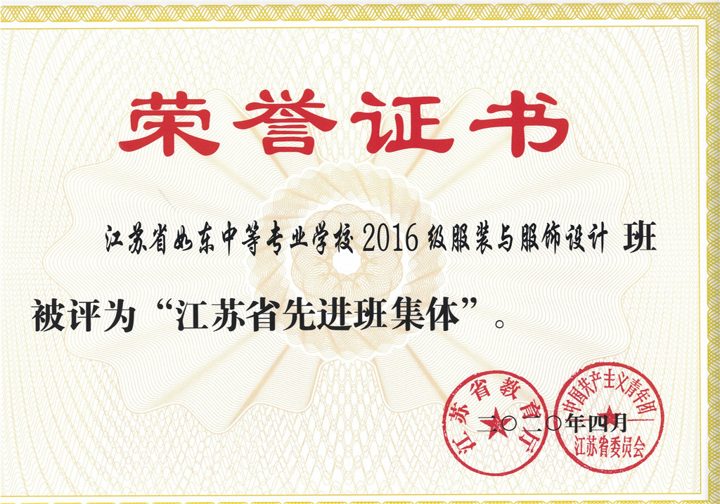 在江苏省教育厅、共青团江苏省委员会组织的评选中,我校2016级服装与服饰设计班、2017级对口 5班、2015级工程造价1班被评为“江苏省先进班集体”,2017级对口7班孙佳妍、2016级会计高职2班郁韩佳、2016级工程造价1班薛花蕊被评为“江苏省优秀学生干部,”2016级商务英语班于文平、2016级工程造价2班马国旗、2016级汽修高职1班缪佳伟、2017级对口4班季丹丹被评为“江苏省三创优秀学生”。