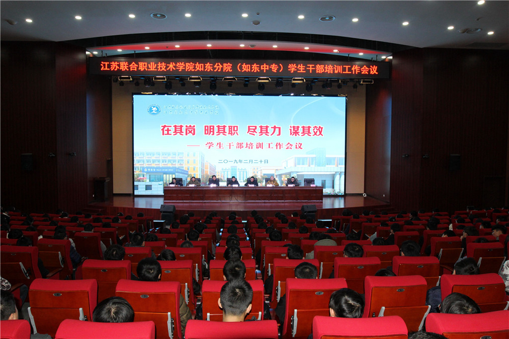 新年新气象,奋进新征程。2月20日,江苏联合职业技术学院如东分院、江苏省如东中等专业学校在学校大报告厅召开新学期学生干部工作会议,总结上学期工作,部署新学期工作。学校校长余飞、党委书记吴金明、副校长孙智明、学工处主任季勇、副主任施亚斌、王小兵、校团委书记胡娜,各系部主任、德育副主任、校、系学生会成员以及各班班长、团支部书记近400人参加会议。会议由校团委胡娜书记主持。