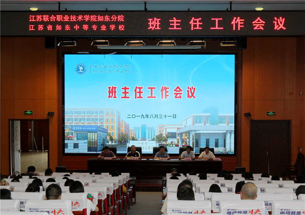 8月31日,江苏联合职业技术学院如东分院、江苏省如东中等专业学校在敬业堂召开新学期首次班主任工作会议,学工处成员、各专业系部主任、德育副主任、全体班主任近150人参会。会议由学工处副主任施亚斌主持。