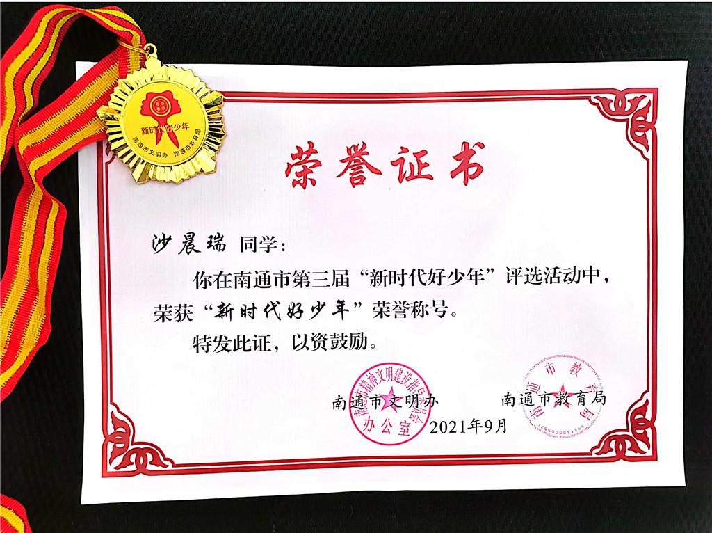 在南通市文明办、南通市教育局组织的南通市第三届“新时代好少年”评选活动中,江苏联合职业技术学院如东分院、江苏省如东中等专业学校2019级机电高职(3)班的沙晨瑞同学脱颖而出,被授予“新时代好少年”荣誉称号。