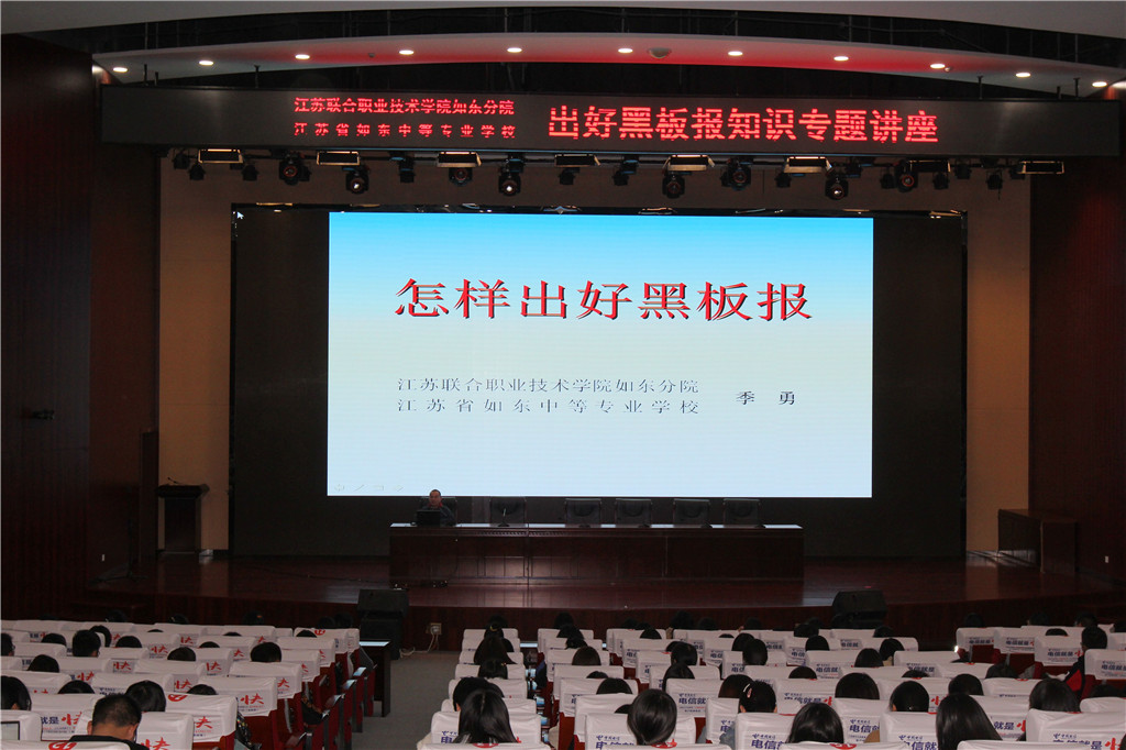11月13日下午,江苏联合职业技术学院如东分院、江苏省如东中等专业学校学工处主任季勇作了一场《出好黑板报》的知识专题讲座。此次讲座由学工处副主任王小兵主持,各系部德育主任、团总支书记、各班班主任、班长、宣传委员、校系两级学生会正副主席、宣传部正副部长、干事等400余人参加了此次活动。