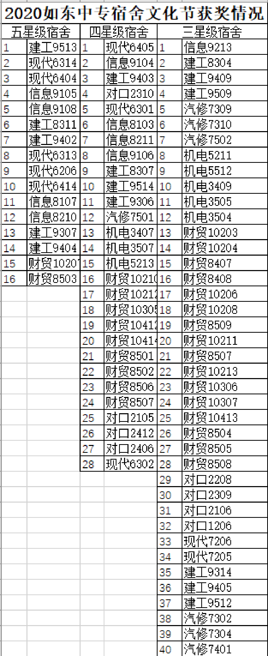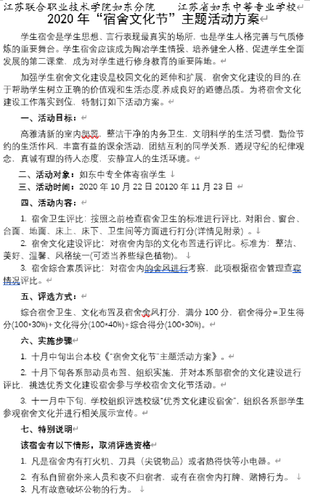从2015年起,江苏联合职业技术学院如东分院、江苏省如东中等专业学校每年都组织“宿舍文化节”,组织学生用独特的创意将专业文化、乡土文化、休闲文化融入每一面墙壁、每一个角落的装扮之中,每年均组织一次评选,从全校数百间宿舍中优选出数十间不同星级的宿舍,通过各种媒介向全校展示,让宿舍文化成为学生净化心灵、展示才艺、丰富生活的重要载体。