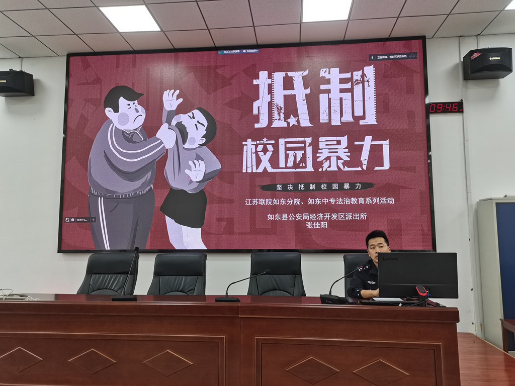 为切实发挥法治课堂的作用,预防校园暴力事件发生,提升学生防霸凌意识和能力。2023年10月13日,如东县公安局经济开发区派出所副所长张佳阳走进江苏联院如东分院、如东中专,以“抵制校园暴力,共建和谐校园”为主题,为全校学生开展了法治教育讲座,全力创建安全文明校园。