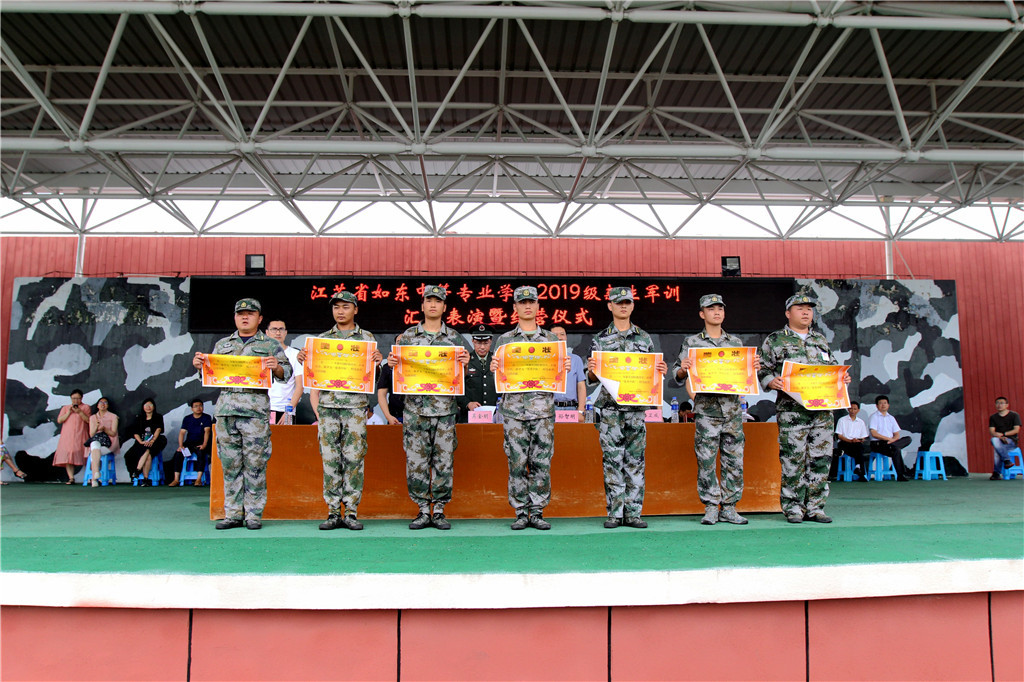 7月17日,新生军训汇报表演暨结营仪式如期举行,学校党委书记吴金明在军训大队长的陪同下检阅了学生列队,同学们步伐矫健、口号响亮,点点汗水折射出阳光的热烈,诉说着青春的激情,展现了如东中专学子的坚毅与自信。在陈建委员宣读表彰决定后,主席台领导为优秀军训中队和优秀军训学员颁发了奖状和证书。