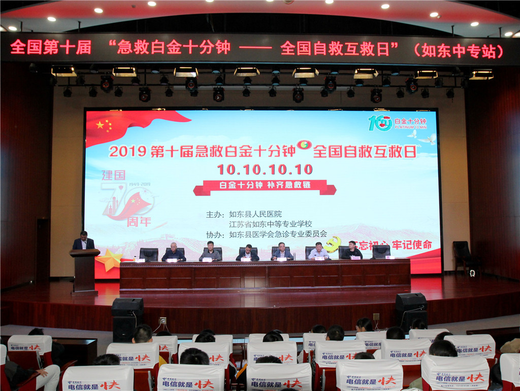 为贯彻社会主义核心价值观,普及急救技能,献礼新中国成立七十周年, 10月10日上午,江苏联合职业技术学院如东分院、江苏省如东中等专业学校与如东县人民医院联合开展了“白金十分钟,补齐急救链”主题宣传培训活动,如东县科协副主席施中华、如东县卫健委副主任缪文龙、江苏省如东中等专业学校校长余飞、如东县人民医院院长季学军等领导参加了活动。学校建筑工程系近300名师生参与了宣传培训活动。
