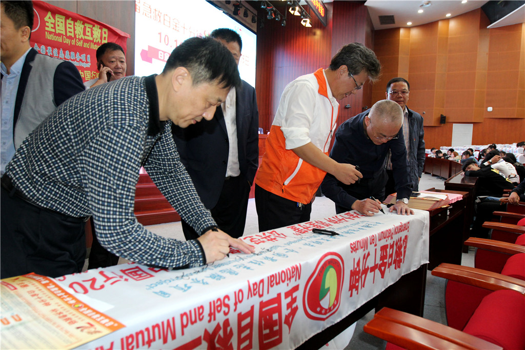 余飞校长在“急救白金十分钟,全国自救互救活动日”条幅上签名