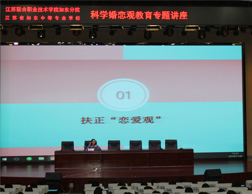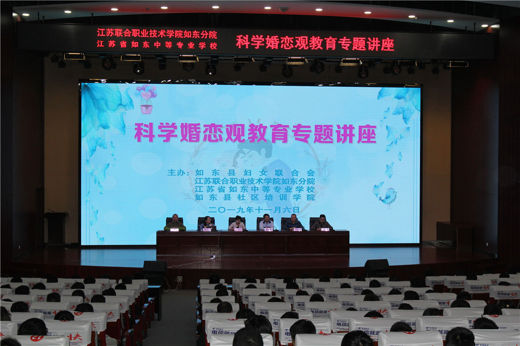 为进一步满足新时代青年日益增长的美好生活需要,帮助青年学生树立正确的婚恋观,11月6日,江苏联合职业技术学院如东分院、江苏省如东中等专业学校举行科学婚恋观教育专题讲座,如东县妇联副主席汪爱平、如东中专副校长孙智明、学工处主任季勇、社区教育处主任薛应华、学工处副主任王小兵出席活动,全校各专业系部近500名学生代表参加。活动由季勇主任主持。