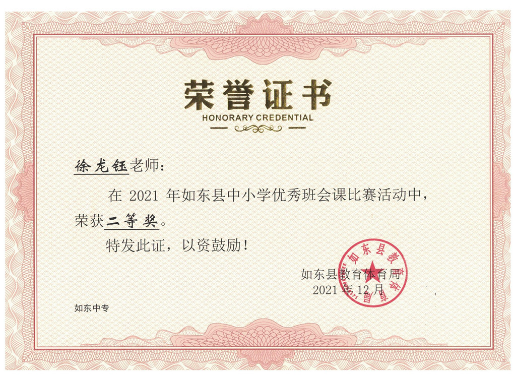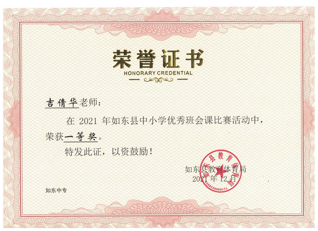 日前,江苏联合职业技术学院如东分院、江苏省如东中等专业学校组织班主任参加2021年如东县中小学优秀班会课比赛成绩揭晓,秦小玉、吉倩华两位教师荣获一等奖,宋丽华、徐龙钰两位教师荣获二等奖。