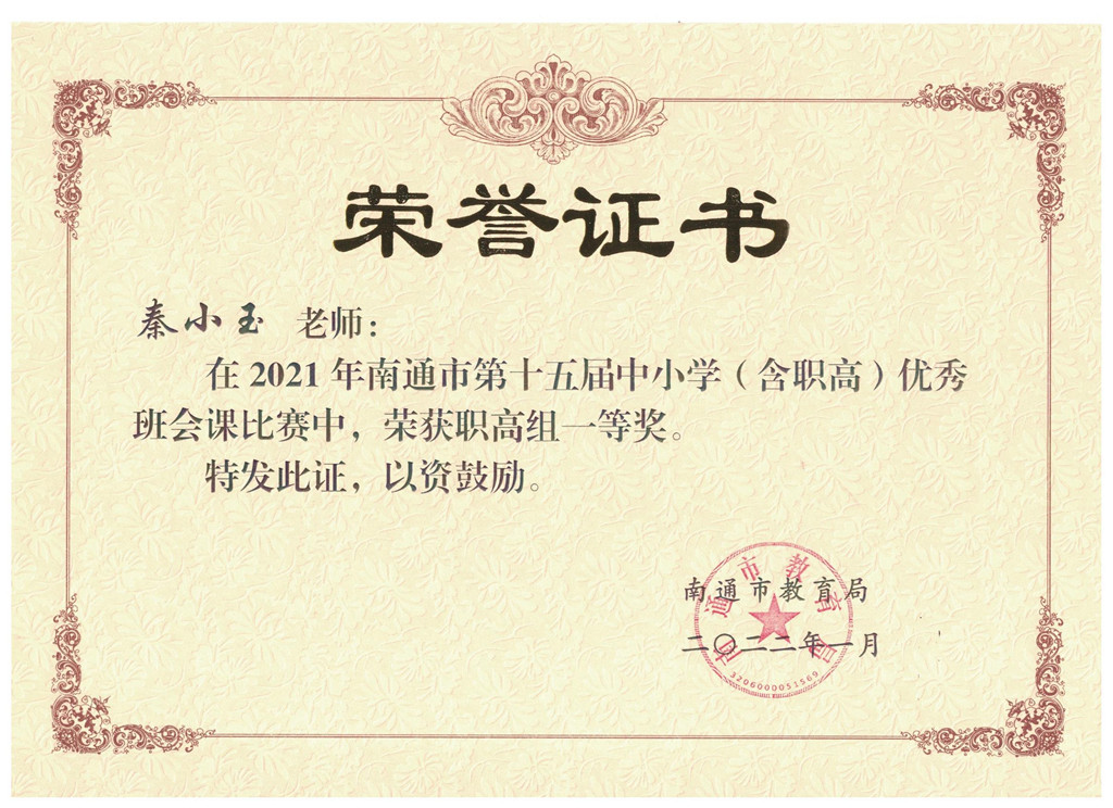 近日,南通市教育局发文公布南通市第十五届中小学(含职高)优秀班会课比赛结果,江苏联合职业技术学院如东分院、江苏省如东中等专业学校参赛的秦小玉、吉倩华两位班主任老师均获得市一等奖的喜人成绩。