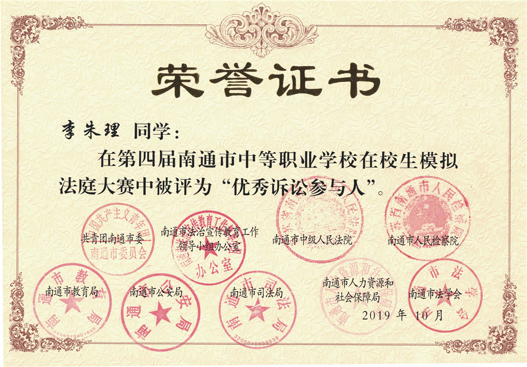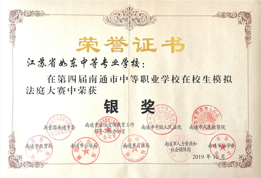 10月22日,由共青团南通市委、市中级人民法院、市检察院、市教育局、市公安局、市司法局、市人力资源和社会保障局、市法学会、市法制宣传教育工作领导小组9家单位组织的第四届南通市中等职业学校在校生模拟法庭大赛在南通市中级人民法院举行。在南通市所有职校参加的初赛中,江苏联合职业技术学院如东分院、江苏省如东中等专业学校代表队经过激烈的预赛角逐,成功挺进市赛决赛,并最终取得第二名的好成绩。机电工程系李合庆获“优秀模拟法官”称号、建筑工程系丁嘉怡和李朱理获“优秀诉讼参与人”称号。