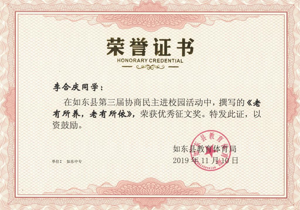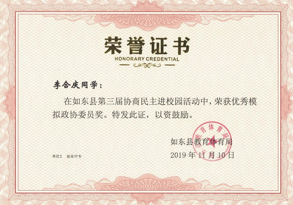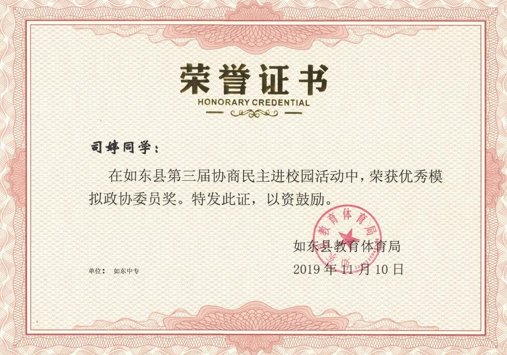 2019年5月以来,如东县教育体育局举办了第三届协商民主进校园活动,江苏联合职业技术学院如东分院、江苏省如东中等专业学校3名同学撰写的《关于当代学生网络游戏的调查报告》荣获“最佳调研报告奖”,1名同学撰写的《守护绿色家园》荣获“最佳征文奖”,1名同学撰写的《老有所养,老有所依》荣获“优秀征文奖”,上述5名同学均获“优秀模拟政协委员奖”。