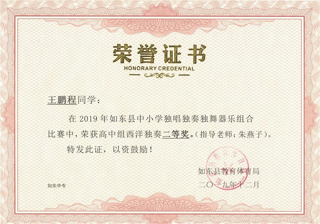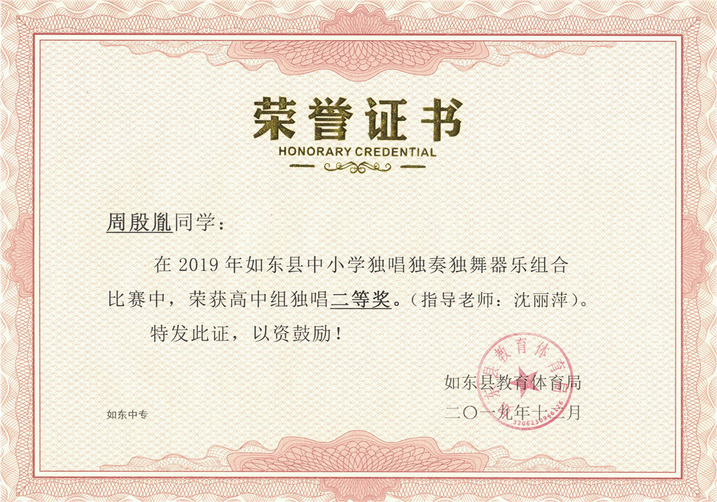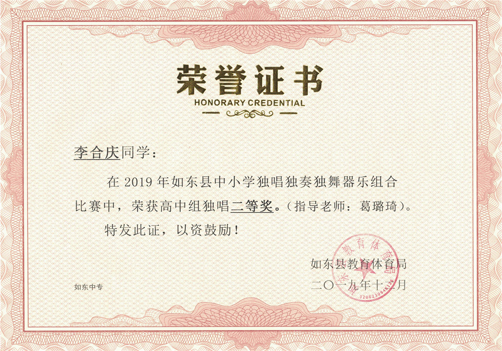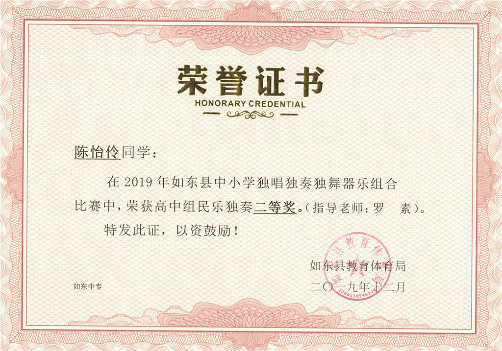在2019年如东县中小学独唱独奏独舞器乐组合比赛中,江苏联合职业技术学院如东分院、江苏省如东中等专业学校的2名学生分获单项一等奖、7名学生分获单项二等奖;2名教师荣获优秀指导老师奖。学校在2019年如东县“江海天籁”中小学生合唱比赛中荣获优秀表演二等奖。