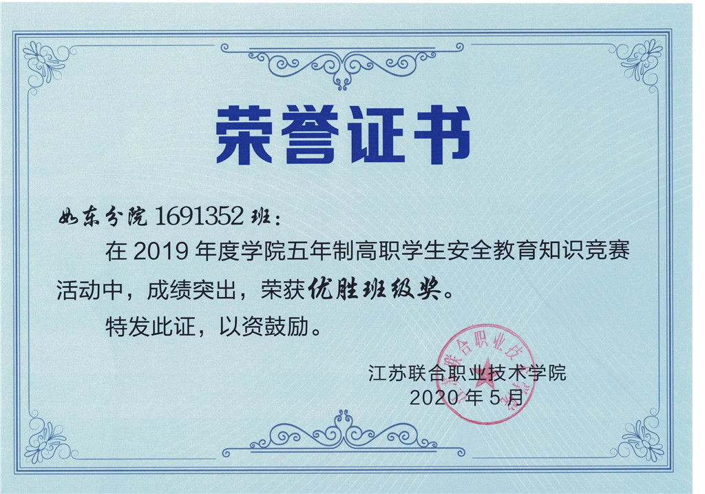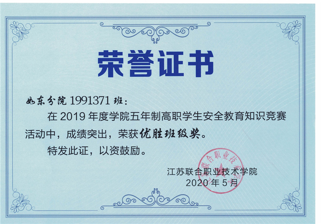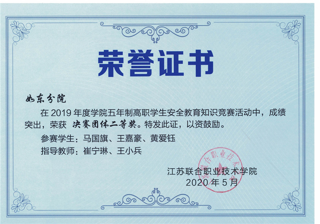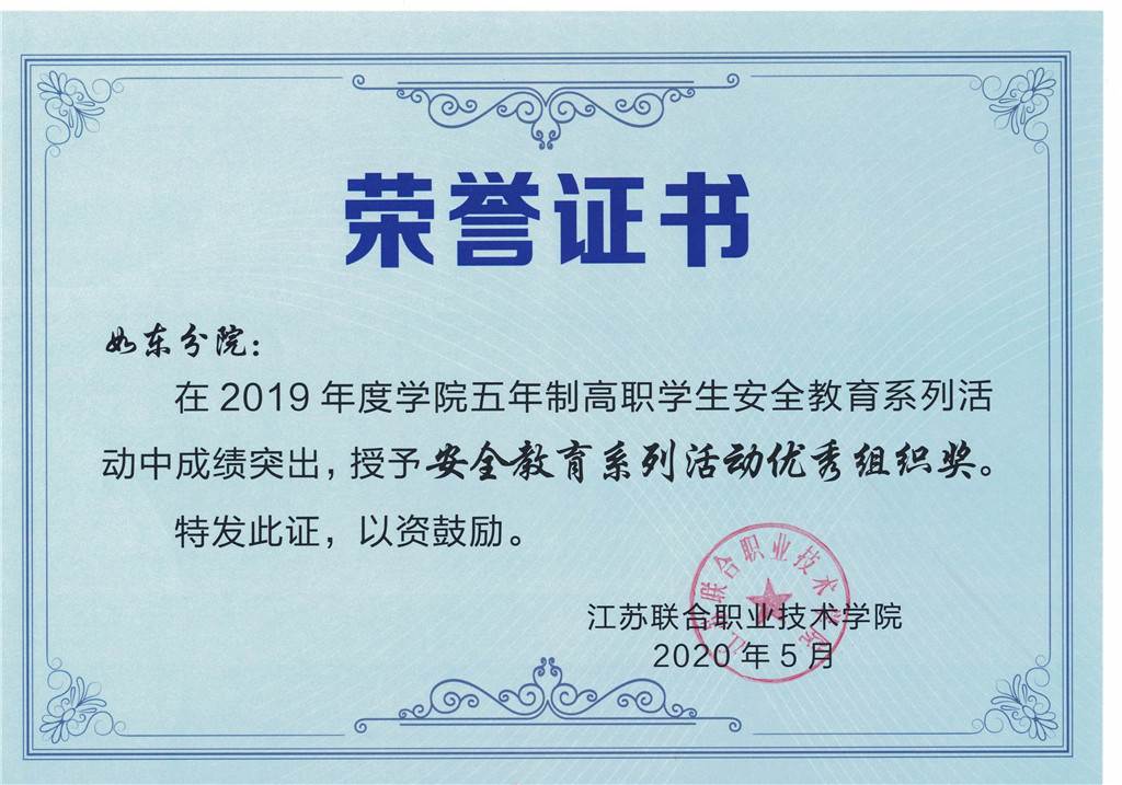 在2019年度江苏联合职业技术学院五年制高职学生安全教育系列活动中,江苏联合职业技术学院如东分院认真组织,积极备赛,取得了优异成绩。安全教育知识竞赛活动中,共有79名学生获 “个人优胜奖”、7个班级获“优胜班级奖”,学校荣获“决赛团体二等奖”;在学生应急救护技能竞赛中,学校荣获“团体二等奖”。学校(分院)被授予安全教育系列活动“优秀组织奖”。