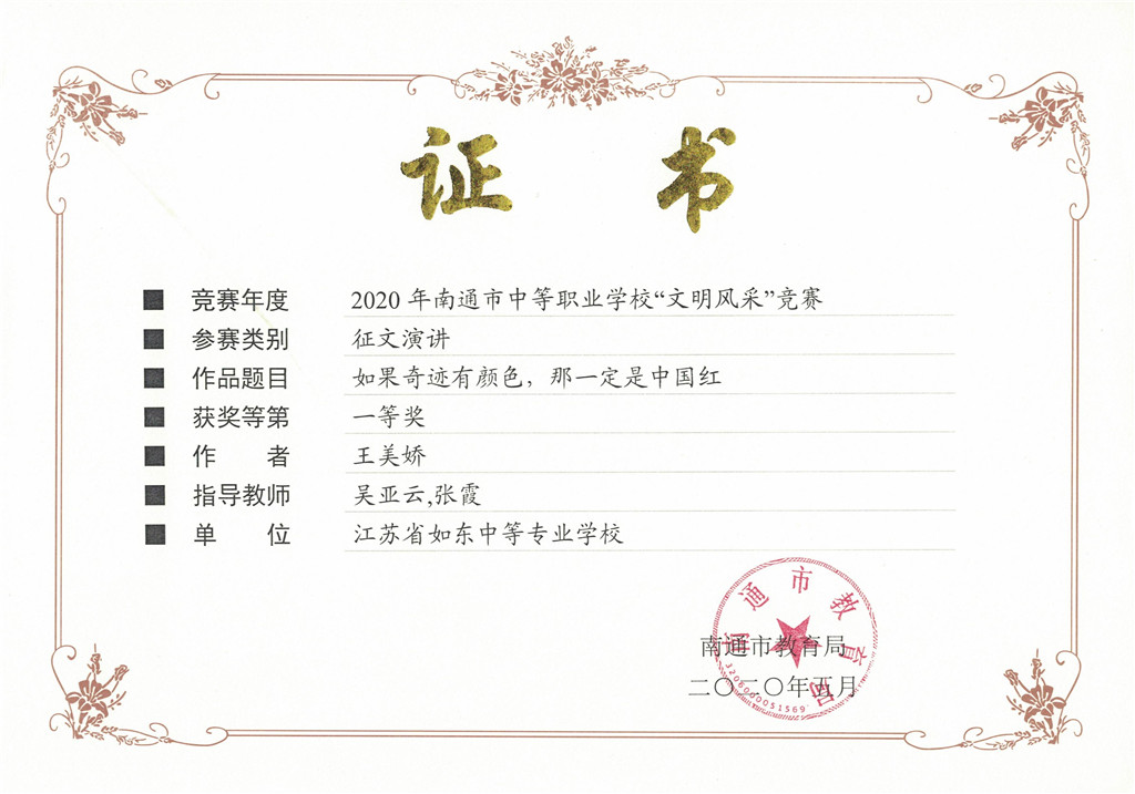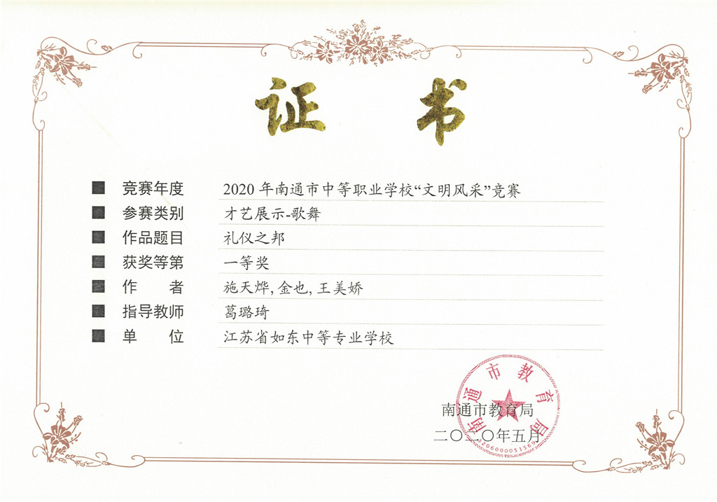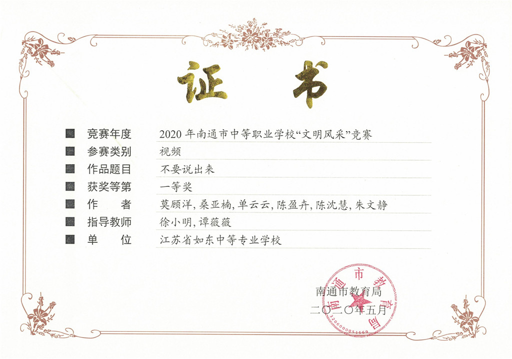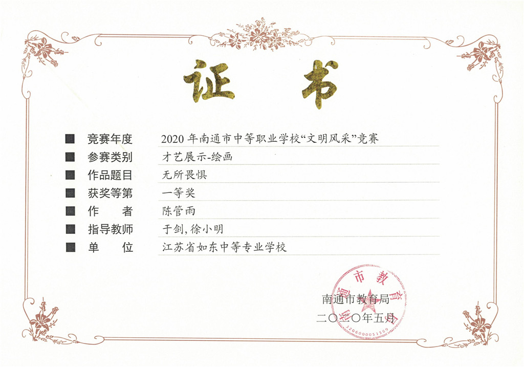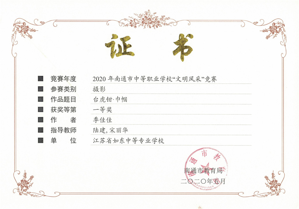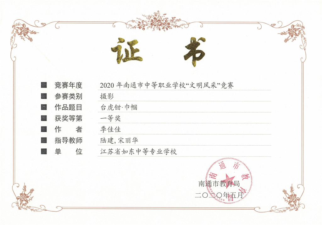 近日,省市文明风采竞赛活动证书下发,江苏联合职业技术学院如东分院、江苏省如东中等专业学校获得佳绩:在第十一届省文明风采竞赛活动中,有4件作品获最佳作品奖,于剑、徐小明、缪玲娟、杨玉梅、吴亚云、张霞、管凌艳、王海峰等8位老师获“优秀指导教师”称号;在2020年南通市中等职业学校“文明风采”竞赛中活动,有20件作品获一等奖,有36件作品获二等奖,有12件作品获三等奖,有10件作品获优秀奖。