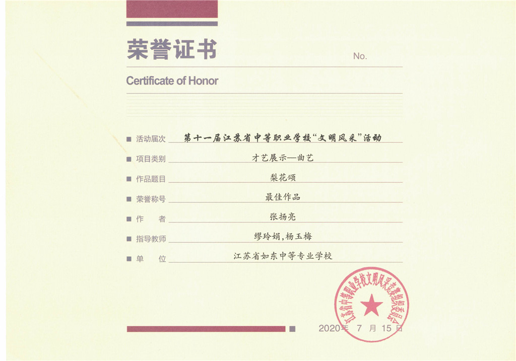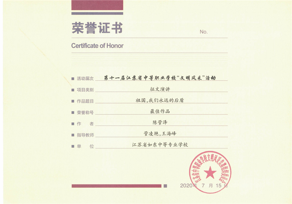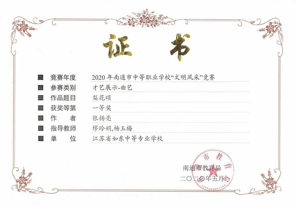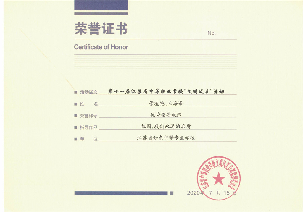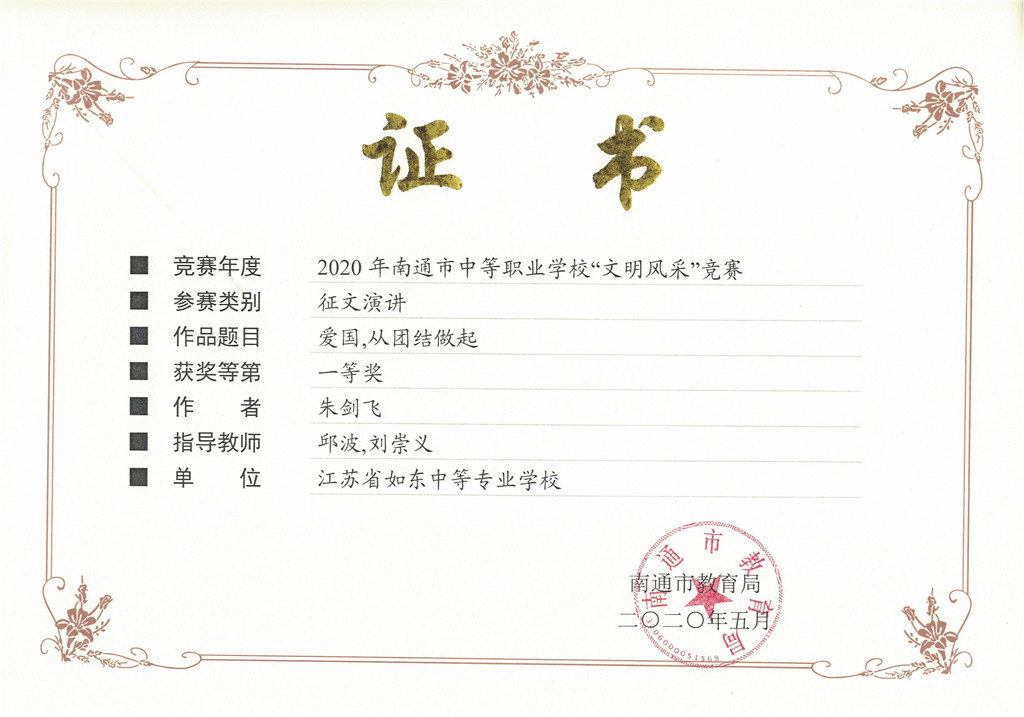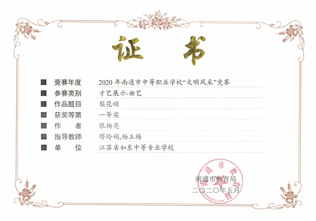 近日,省市文明风采竞赛活动证书下发,江苏联合职业技术学院如东分院、江苏省如东中等专业学校获得佳绩:在第十一届省文明风采竞赛活动中,有4件作品获最佳作品奖,于剑、徐小明、缪玲娟、杨玉梅、吴亚云、张霞、管凌艳、王海峰等8位老师获“优秀指导教师”称号;在2020年南通市中等职业学校“文明风采”竞赛中活动,有20件作品获一等奖,有36件作品获二等奖,有12件作品获三等奖,有10件作品获优秀奖。