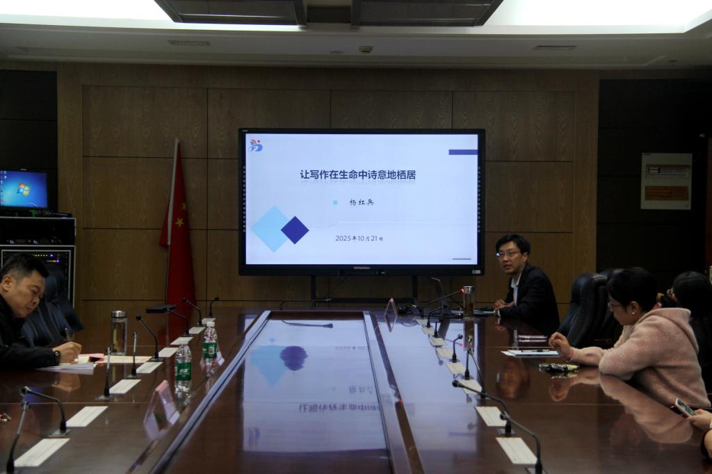 如东县教师发展中心副主任、成职教办主任,《海洲书坛》始创者杨红兵作《让写作在生命中诗意地栖居》主题分享。作为《江苏教育报》特约评论员,他已在《莫愁》《阅读》《扬子晚报》等数十家报刊发表散文、随笔、诗歌、书评近百篇。杨红兵提出:阅读与写作既是生活态度,更是精神寄托;鼓励教师“读三本大书”——向纸质经典沉淀,向无字生活取材,向教研实践深耕,以反复打磨的旧稿为径,把阅读所得化为教育行动与生命文字。