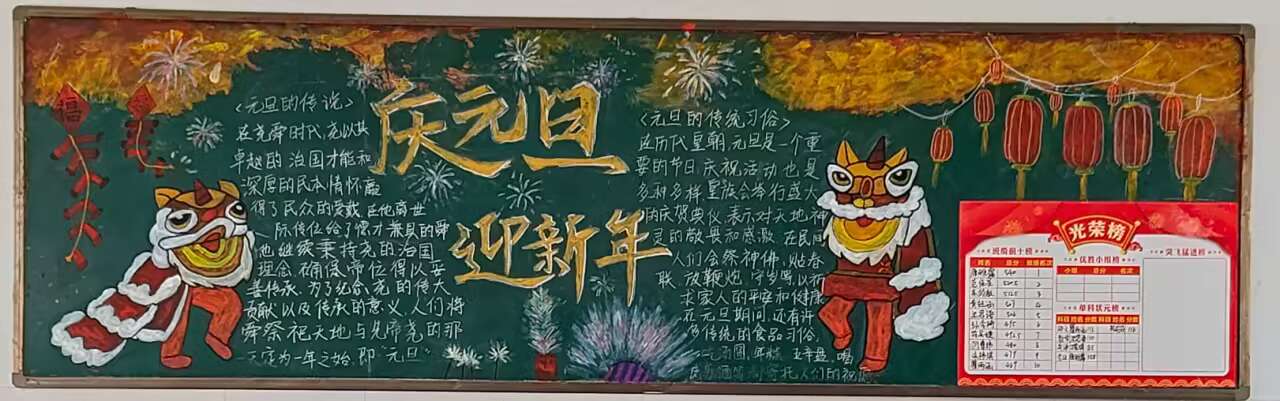 为了烘托学校的节日气氛,激发学生的集体荣誉感和团结合作的意识,学校团委组织开展了以“庆元旦·迎新年”为主题的黑板报评比活动。