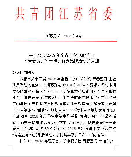 上级各级团组织十分重视该项工作,经自主申报,县、市团委评审、推报,近期,团省委公布了30个活动被评为江苏省中学中职学校“青春五月”优秀品牌活动,南通市共2个活动获得该项荣誉,我校团委组织的“关注特殊儿童,情暖与爱同行”活动名列其中。