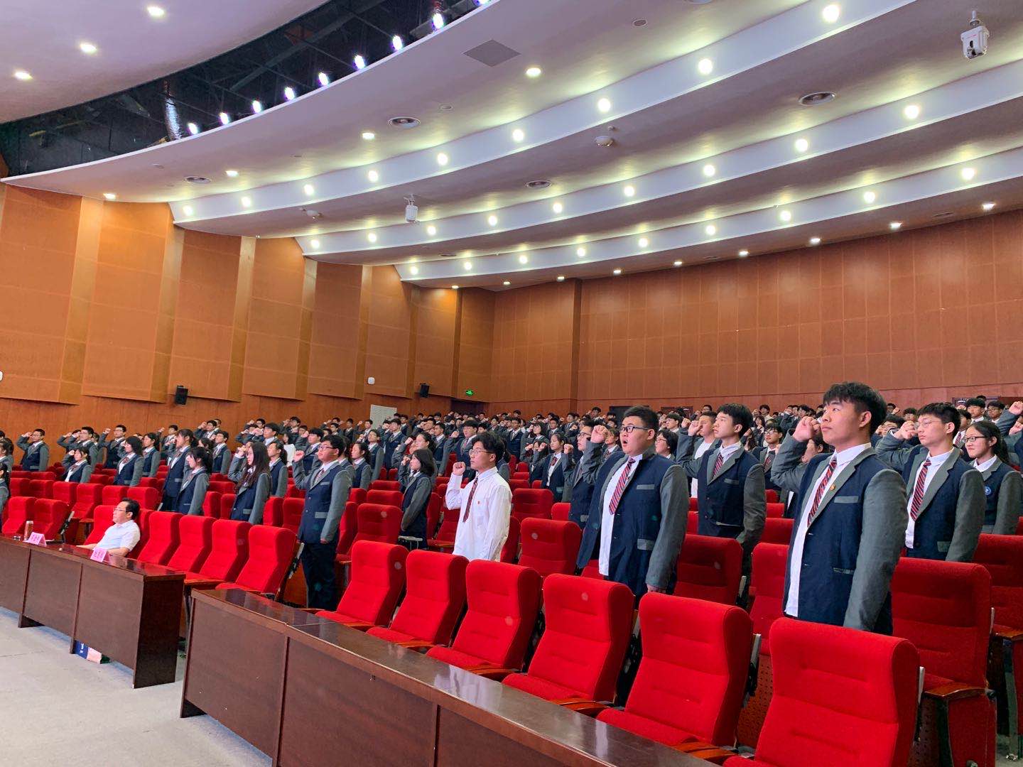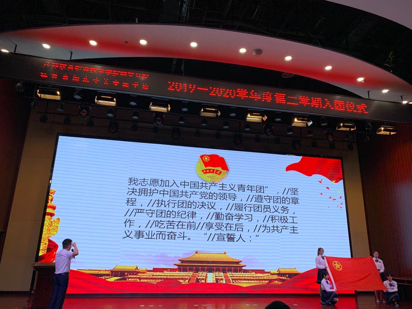 第二个议程:在庄严的国歌声中如东中专2019-2020学年度第二学期入团仪式正式开始,首先由主持人说明了入团的意义,宣读了新团员名单,本期共有240名同学加入了共青团组织。随后,老团员代表给新团员代表佩戴团徽。接着在团委书记赵志鹏的带领下,每位新团员面向团旗、右手握拳举过肩膀在团旗下庄严宣誓。来自建筑工程系的薛花蕊同学代表老团员发言,她告诉新团员入团不只是形式,而是一种责任,对新团员的成长提出了建议;紧接着来自信息工程系的顾唯一作为新团员代表发言,她说出了所有新团员的心声,立志做一名优秀的共青团员,努力学习,做品学兼优的好学生,以优越的成绩回报老师,回报祖国。