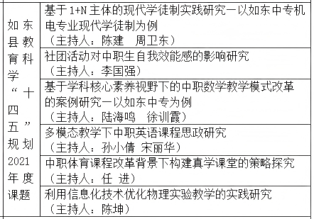 5月20日下午,如东中专举办如东县教育科学“十四五”规划2021年度课题结题活动。特邀鉴定专家,各课题组主持人及核心成员,课题管理人员参加了此次活动。活动由学校科研处主任徐冬梅主持。