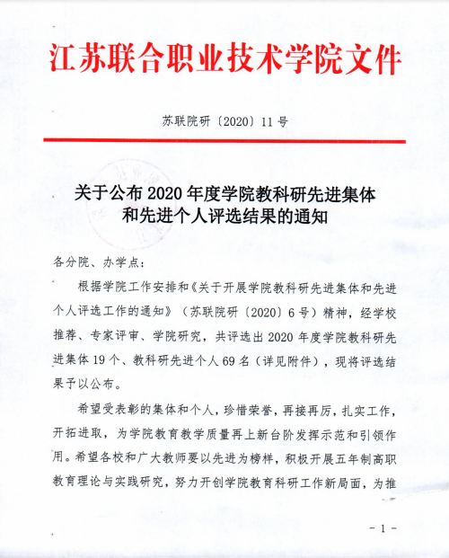 近日,江苏联合职业技术学院发出通知,表彰2020年度教科研先进个人,本次受到表彰的先进个人共69名,我校赵建峰老师名列其中。