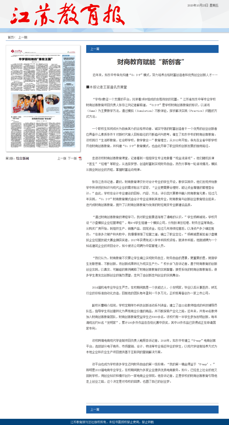 10月23日,江苏教育报以《财商教育赋能“新创客”》为题,对我校财商教育进行了专题报道。